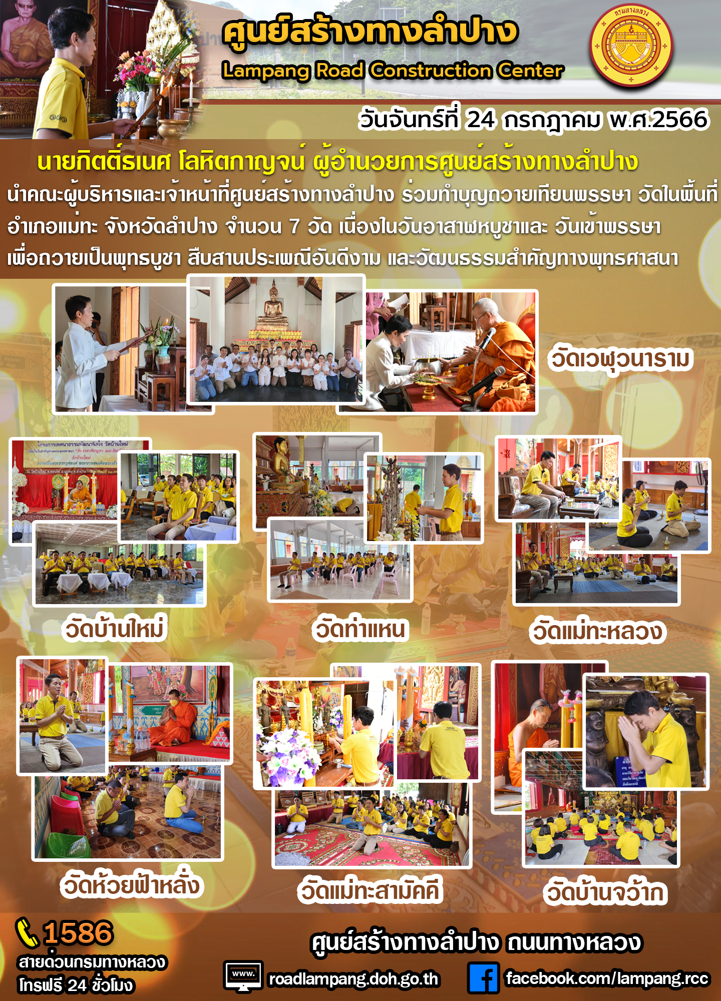 นายกิตติ์ธเนศ โลหิตกาญจน์ ผู้อำนวยการศูนย์สร้างทางลำปาง นำคณะผู้บริหารและเจ้าหน้าที่ศูนย์สร้างทางลำปาง ร่วมทำบุญถวายเทียนพรรษา วัดในพื้นที่อำเภอแม่ทะ จังหวัดลำปาง จำนวน 7 วัด เนื่องในวันอาสาฬหบูชาและ วันเข้าพรรษา เพื่อถวายเป็นพุทธบูชา สืบสานประเพณีอันดีงาม และวัฒนธรรมสำคัญทางพุทธศาสนา