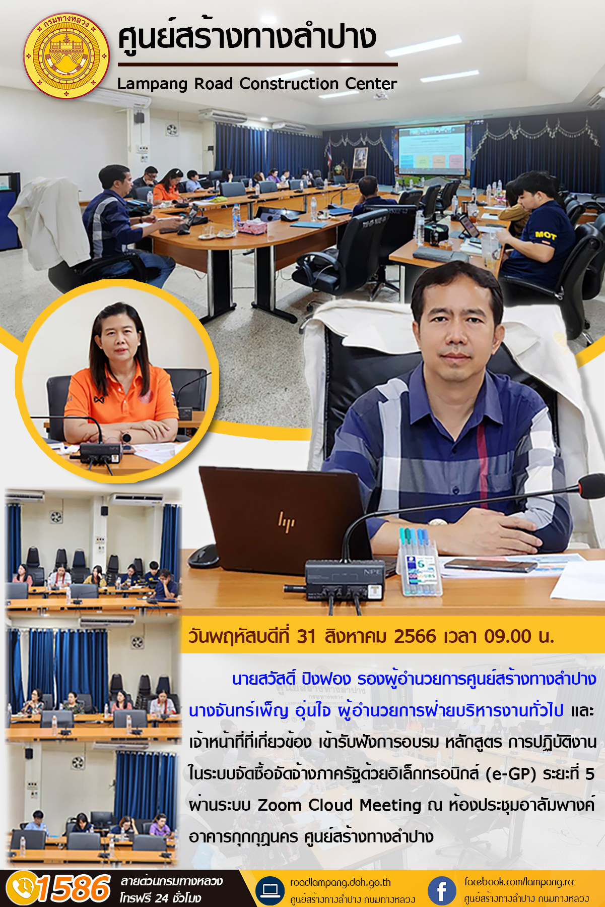 นายสวัสดิ์ ปิงฟอง รองผู้อำนวยการศูนย์สร้างทางลำปาง นางจันทร์เพ็ญ อุ่นใจ ผู้อำนวยการฝ่ายบริหารงานทั่วไป และเจ้าหน้าที่ที่เกี่ยวข้อง เข้ารับฟังการอบรม หลักสูตร การปฏิบัติงานในระบบจัดซื้อจัดจ้างภาครัฐด้วยอิเล็กทรอนิกส์ (e-GP) ระยะที่ 5 ผ่านระบบ Zoom Cloud Meeting ณ ห้องประชุมอาลัมพางค์ อาคารกุกกุฎนคร ศูนย์สร้างทางลำปาง