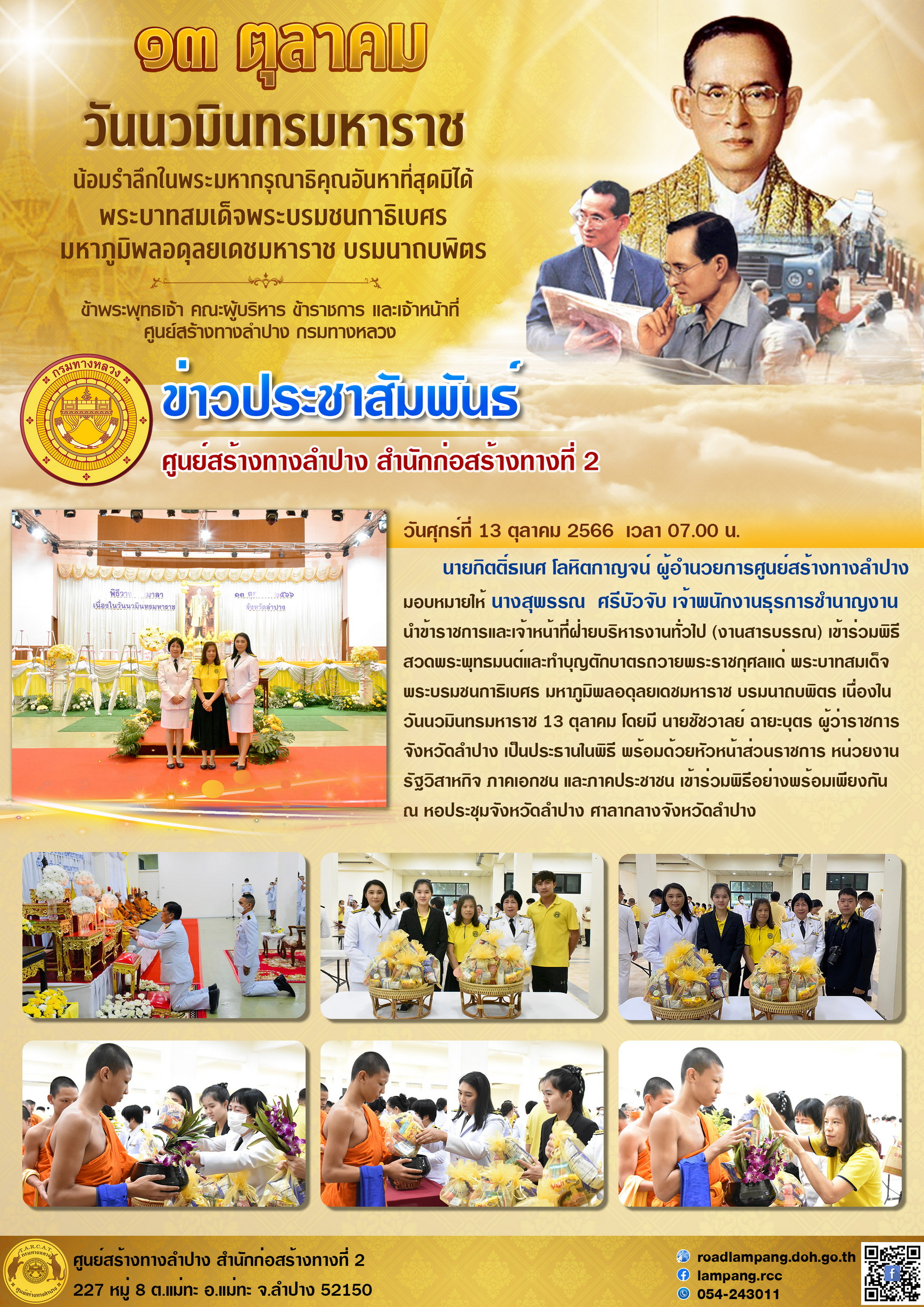 นายกิตติ์ธเนศ โลหิตกาญจน์ ผู้อำนวยการศูนย์สร้างทางลำปาง มอบหมายให้ นางสุพรรณ ศรีบัวจับ เจ้าพนักงานธุรการชำนาญงาน นำข้าราชการและเจ้าหน้าที่ฝ่ายบริหารงานทั่วไป (งานสารบรรณ) เข้าร่วมพิธีสวดพระพุทธมนต์และทำบุญตักบาตรถวายพระราชกุศลแด่ พระบาทสมเด็จพระบรมชนกาธิเบศร มหาภูมิพลอดุลยเดชมหาราช บรมนาถบพิตร เนื่องในวันนวมินทรมหาราช 13 ตุลาคม โดยมี นายชัชวาลย์ ฉายะบุตร ผู้ว่าราชการจังหวัดลำปาง เป็นประธานในพิธี พร้อมด้วยหัวหน้าส่วนราชการ หน่วยงานรัฐวิสาหกิจ ภาคเอกชน และภาคประชาชน เข้าร่วมพิธีอย่างพร้อมเพียงกัน ณ หอประชุมจังหวัดลำปาง ศาลากลางจังหวัดลำปาง