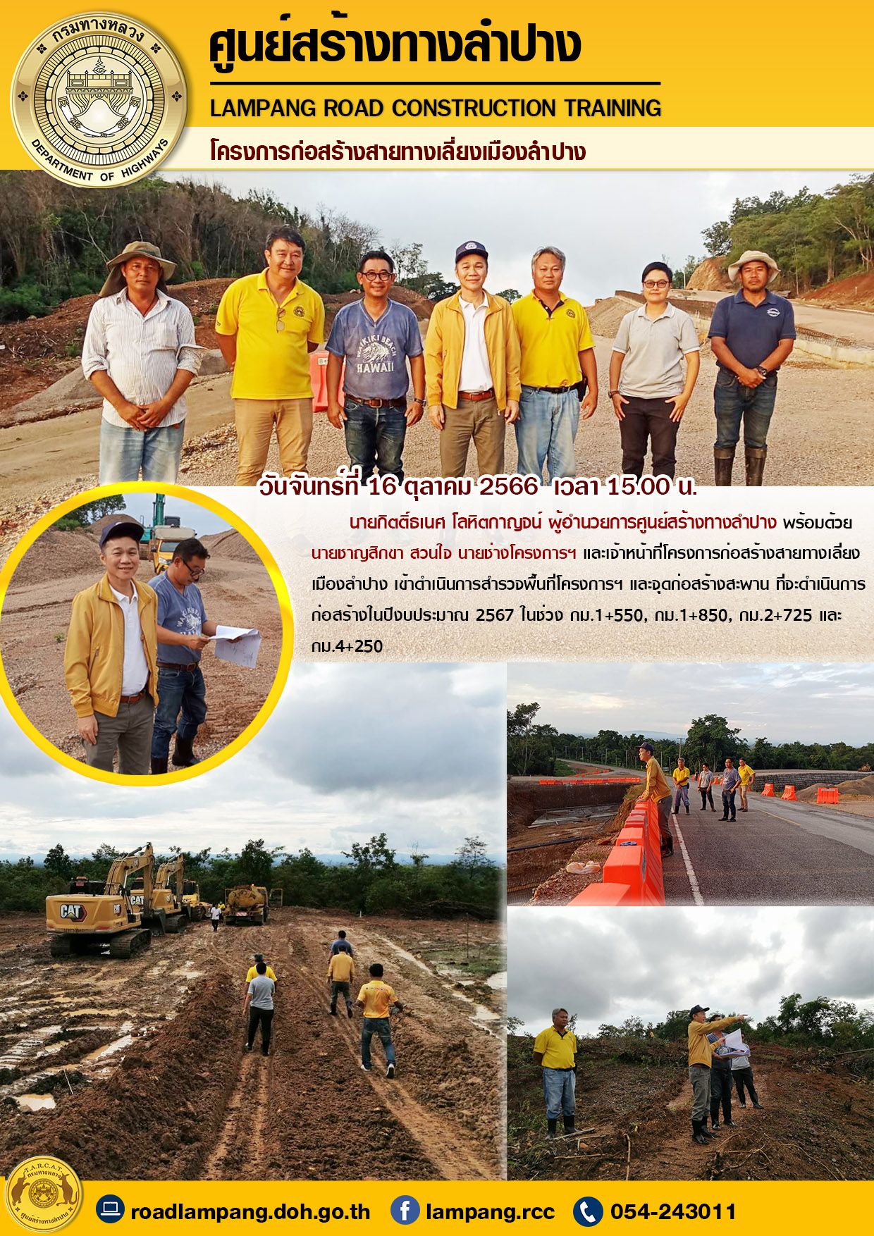นายกิตติ์ธเนศ โลหิตกาญจน์ ผู้อำนวยการศูนย์สร้างทางลำปาง พร้อมด้วย นายชาญสิกขา สวนใจ นายช่างโครงการฯ และเจ้าหน้าที่โครงการก่อสร้างสายทางเลี่ยงเมืองลำปาง เข้าดำเนินการสำรวจพื้นที่โครงการฯและจุดก่อสร้างสะพาน ที่จะดำเนินการก่อสร้างในปีงบประมาณ 2567 ช่วง กม.1+550, กม.1+850, กม.2+725 และ กม.4+250