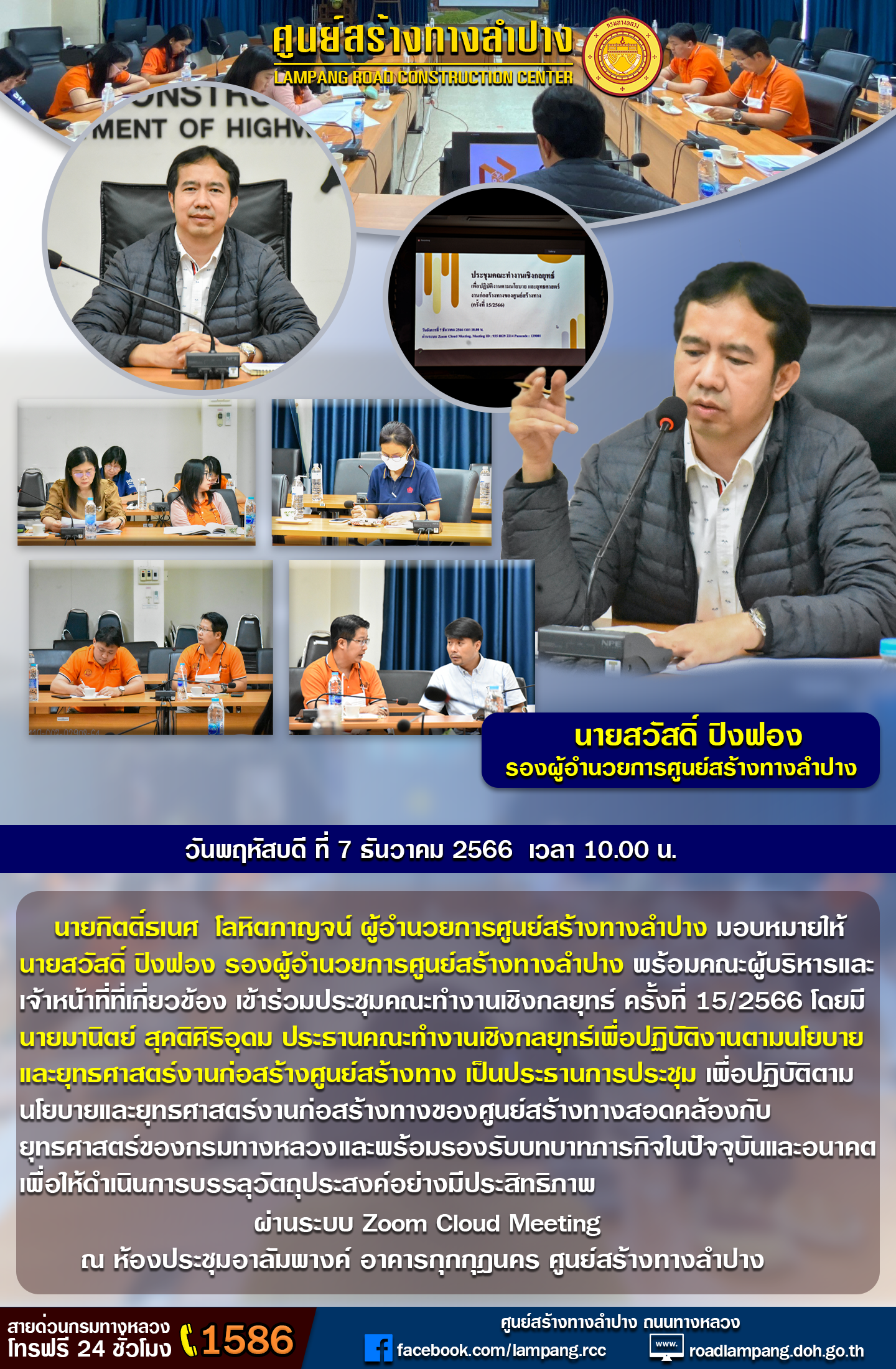 นายกิตติ์ธเนศ โลหิตกาญจน์ ผู้อำนวยการศูนย์สร้างทางลำปาง มอบหมายให้ นายสวัสดิ์ ปิงฟอง รองผู้อำนวยการศูนย์สร้างทางลำปาง พร้อมคณะผู้บริหารและเจ้าหน้าที่ที่เกี่ยวข้อง เข้าร่วมประชุมคณะทำงานเชิงกลยุทธ์ ครั้งที่ 15/2566 โดยมี นายมานิตย์ สุคติศิริอุดม ประธานคณะทำงานเชิงกลยุทธ์เพื่อปฏิบัติงานตามนโยบาย และยุทธศาสตร์งานก่อสร้างศูนย์สร้างทาง เป็นประธานการประชุม เพื่อปฎิบัติตามนโยบายและยุทธศาสตร์งานก่อสร้างทางของศูนย์สร้างทางสอดคล้องกับยุทธศาสตร์ของกรมทางหลวง และพร้อมรองรับบทบาทภารกิจในปัจจุบันและอนาคตเพื่อให้ดำเนินการบรรลุวัตถุประสงค์อย่างมีประสิทธิภาพ ผ่านระบบ Zoom Cloud Meetingณ ห้องประชุมอาลัมพางค์ อาคารกุกกุฎนคร ศูนย์สร้างทางลำปาง