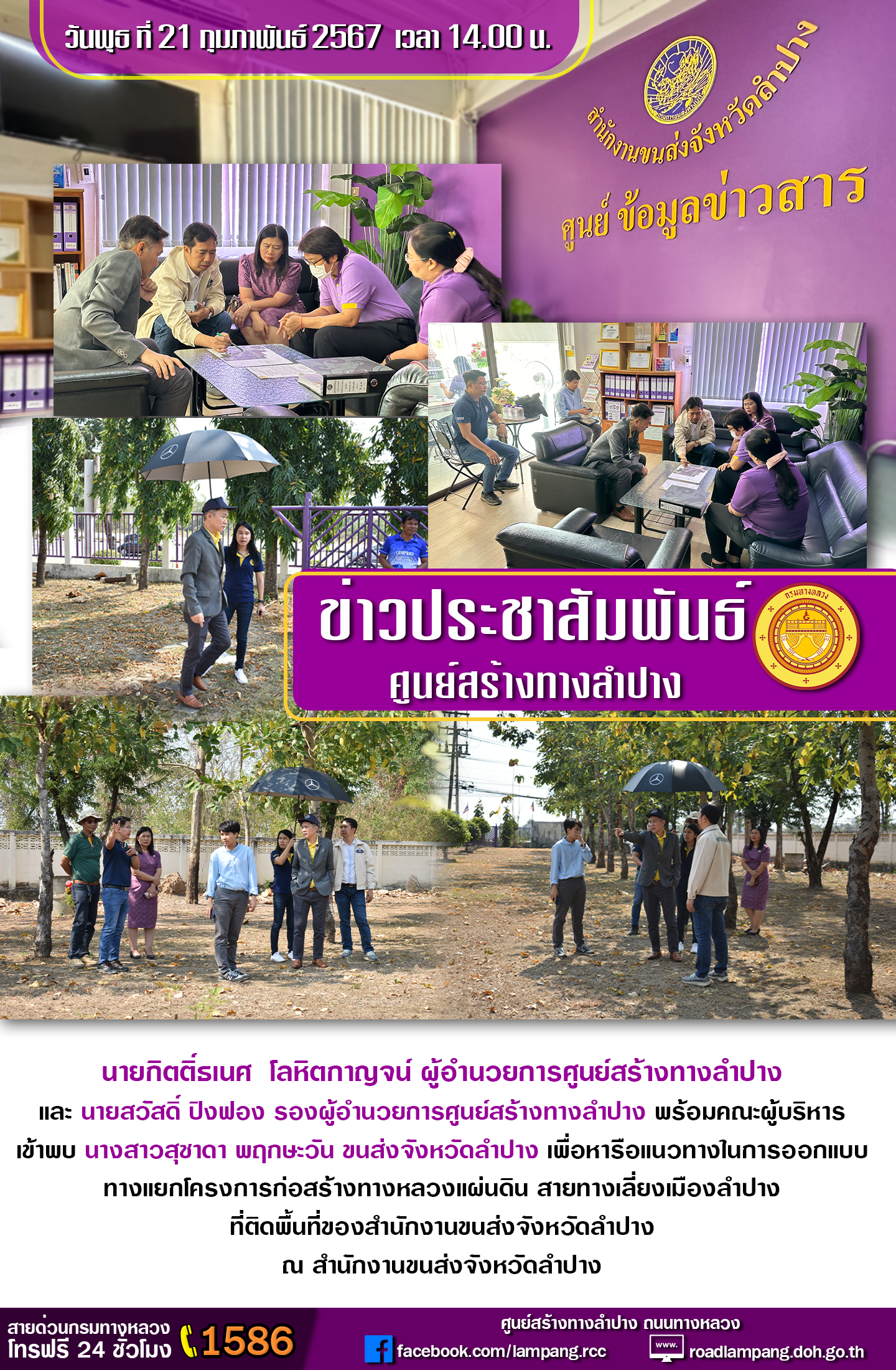 นายกิตติ์ธเนศ โลหิตกาญจน์ ผู้อำนวยการศูนย์สร้างทางลำปาง และ นายสวัสดิ์ ปิงฟอง รองผู้อำนวยการศูนย์สร้างทางลำปาง พร้อมคณะผู้บริหาร เข้าพบ นางสาวสุชาดา พฤกษะวัน ขนส่งจำหวัดลำปาง เพื่อหารือแนวทางในการออกแบบทางแยกโครงการก่อสร้างทางหลวงแผ่นดิน สายทางเลี่ยงเมืองลำปาง ที่ติดพื้นที่ของสำนักงานขนส่งจังหวัดลำปาง ณ สำนักงานขนส่งจังหวัดลำปาง