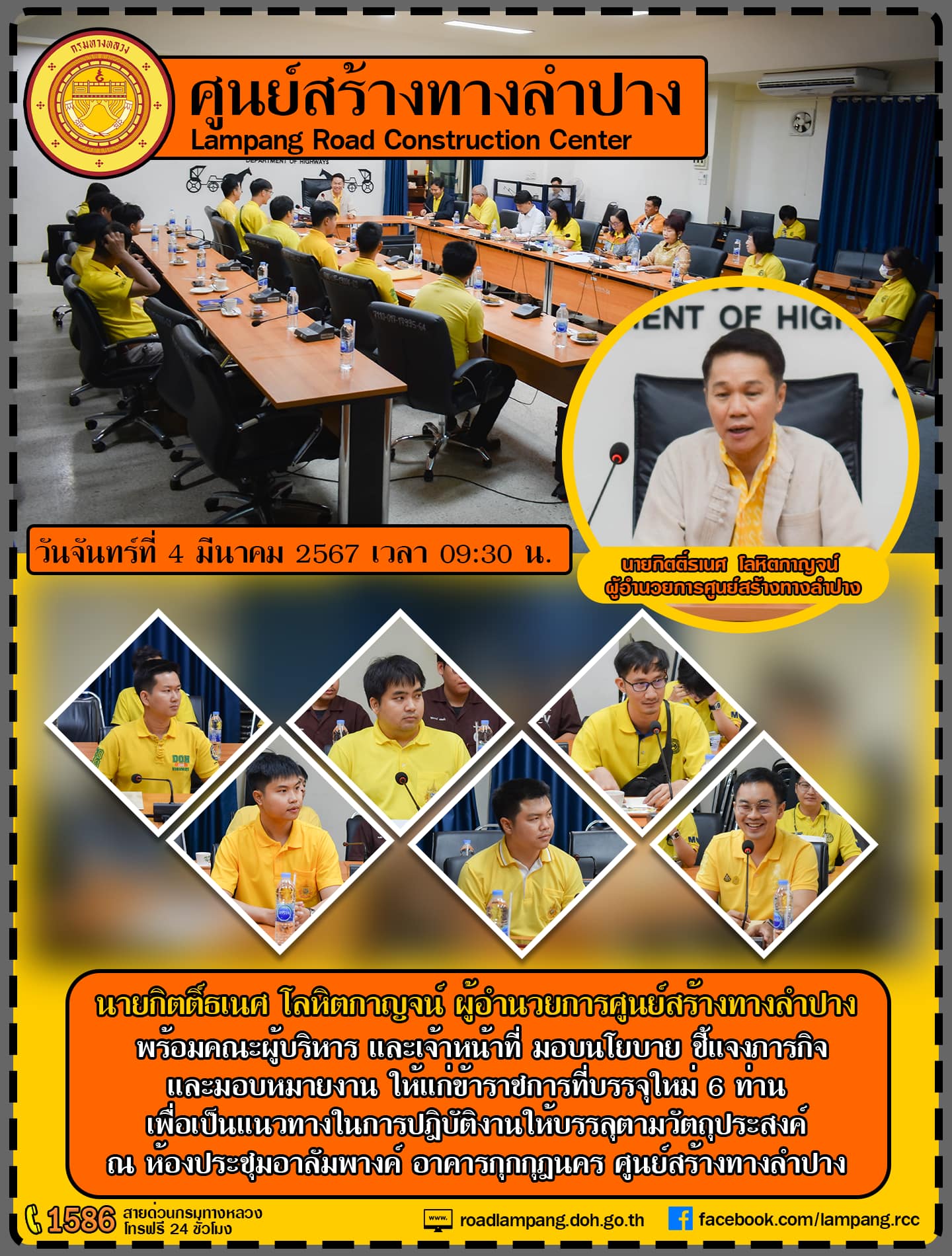 นายกิตติ์ธเนศ โลหิตกาญจน์ ผู้อำนวยการศูนย์สร้างทางลำปาง พร้อมคณะผู้บริหาร และเจ้าหน้าที่ มอบนโยบาย ชี้แจงภารกิจ และมอบหมายงาน ให้แก่ข้าราชการที่บรรจุใหม่ 6 ท่านเพื่อเป็นแนวทางในการปฎิบัติงานให้บรรลุตามวัตถุประสงค์ ณ ห้องประชุมอาลัมพางค์ อาคารกุกกุฎนคร ศูนย์สร้างทางลำปาง