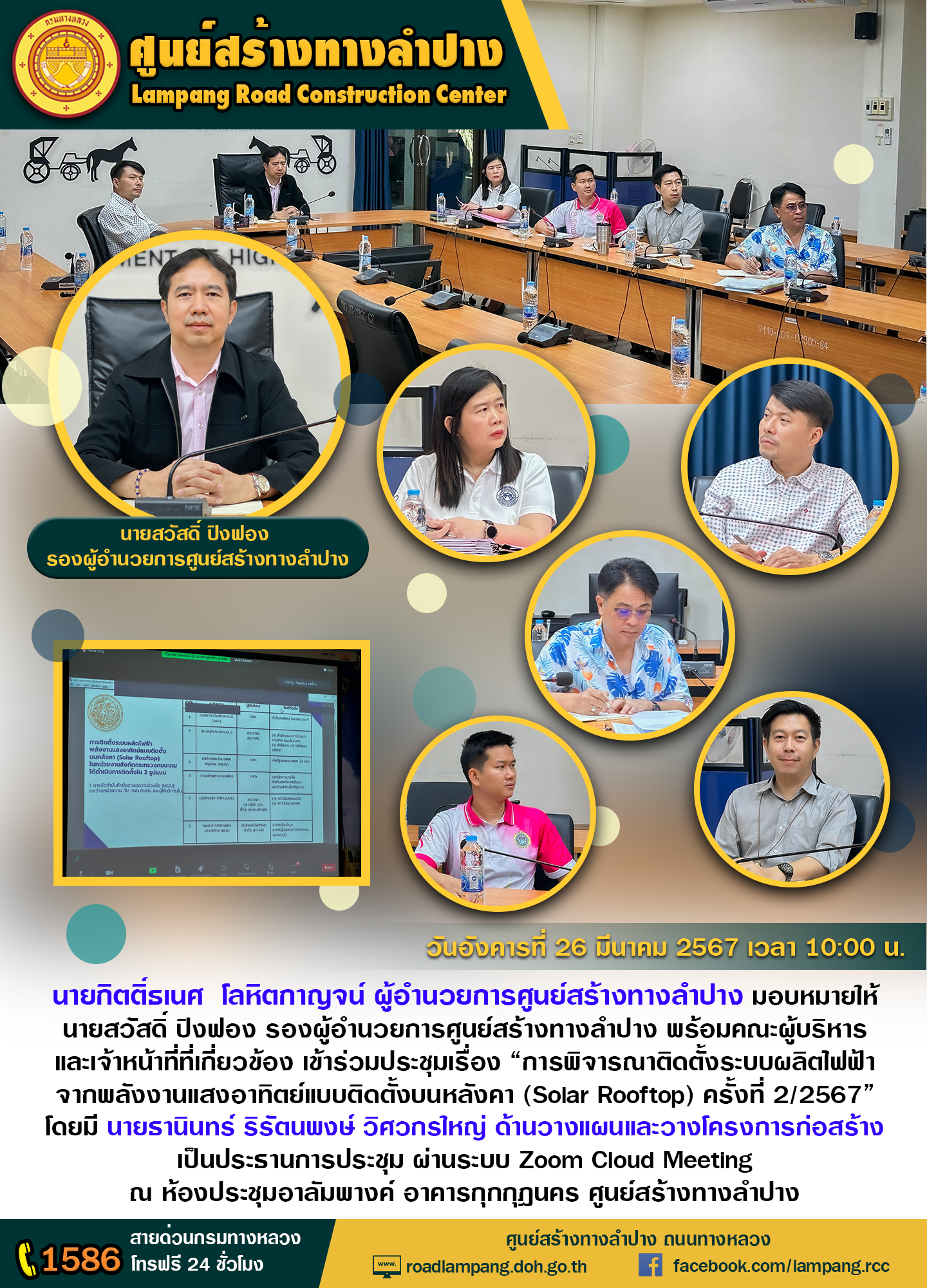 นายกิตติ์ธเนศ โลหิตกาญจน์ ผู้อำนวยการศูนย์สร้างทางลำปาง มอบหมายให้ นายสวัสดิ์ ปิงฟอง รองผู้อำนวยการศูนย์สร้างทางลำปาง พร้อมคณะผู้บริหาร และเจ้าหน้าที่ที่เกี่ยวข้อง เข้าร่วมประชุมเรื่อง “การพิจารณาติดตั้งระบบผลิตไฟฟ้าจากพลังงานแสงอาทิตย์แบบติดตั้งบนหลังคา (Solar Rooftop) ครั้งที่ 2/2567” โดยมี นายธานินทร์ ริรัตนพงษ์ วิศวกรใหญ่ ด้านวางแผนและวางโครงการก่อสร้าง เป็นประธานการประชุม ผ่านระบบ Zoom Cloud Meeting ณ ห้องประชุมอาลัมพางค์ อาคารกุกกุฎนคร ศูนย์สร้างทางลำปาง