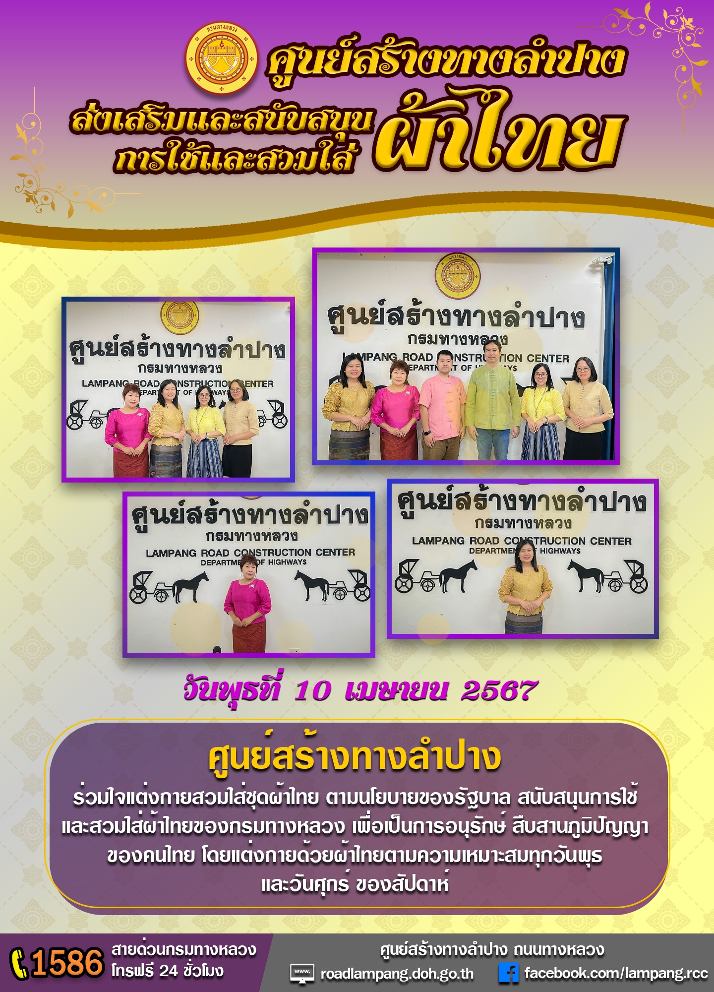 ศูนย์สร้างทางลำปาง ร่วมใจแต่งกายสวมใส่ชุดผ้าไทย ตามนโยบายของรัฐบาล สนับสนุนการใช้ และสวมใส่ผ้าไทยของกรมทางหลวง เพื่อเป็นการอนุรักษ์ สืบสานภูมิปัญญาของคนไทย โดยแต่งกายด้วยผ้าไทยตามความเหมาะสมทุกวันพุธ และ วันศุกร์ ของสัปดาห์