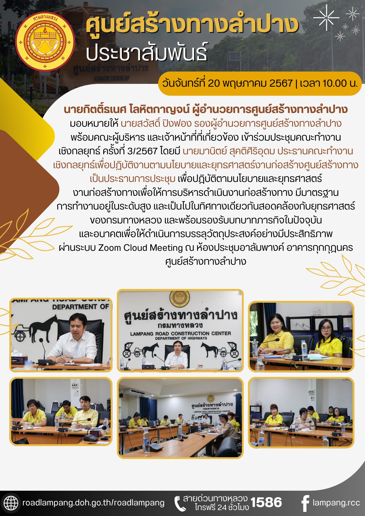 นายกิตติ์ธเนศ โลหิตกาญจน์ ผู้อำนวยการศูนย์สร้างทางลำปาง มอบหมายให้ นายสวัสดิ์ ปิงฟอง รองผู้อำนวยการศูนย์สร้างทางลำปาง พร้อมคณะผู้บริหาร และเจ้าหน้าที่ที่เกี่ยวข้อง เข้าร่วมประชุมคณะทำงานเชิงกลยุทธ์ ครั้งที่ 3/2567 โดยมี นายมานิตย์ สุคติศิริอุดม ประธานคณะทำงานเชิงกลยุทธ์เพื่อปฏิบัติงานตามนโยบายและยุทธศาสตร์งานก่อสร้างศูนย์สร้างทาง เป็นประธานการประชุม เพื่อปฎิบัติตามนโยบายและยุทธศาสตร์งานก่อสร้างทางเพื่อให้การบริหารดำเนินงานก่อสร้างทาง มีมาตรฐานการทำงานอยู่ในระดับสูง และเป็นไปในทิศทางเดียวกันสอดคล้องกับยุทธศาสตร์ของกรมทางหลวง และพร้อมรองรับบทบาทภารกิจในปัจจุบัน และอนาคตเพื่อให้ดำเนินการบรรลุวัตถุประสงค์อย่างมีประสิทธิภาพ ผ่านระบบ Zoom Cloud Meeting ณ ห้องประชุมอาลัมพางค์ อาคารกุกกุฎนคร ศูนย์สร้างทางลำปาง