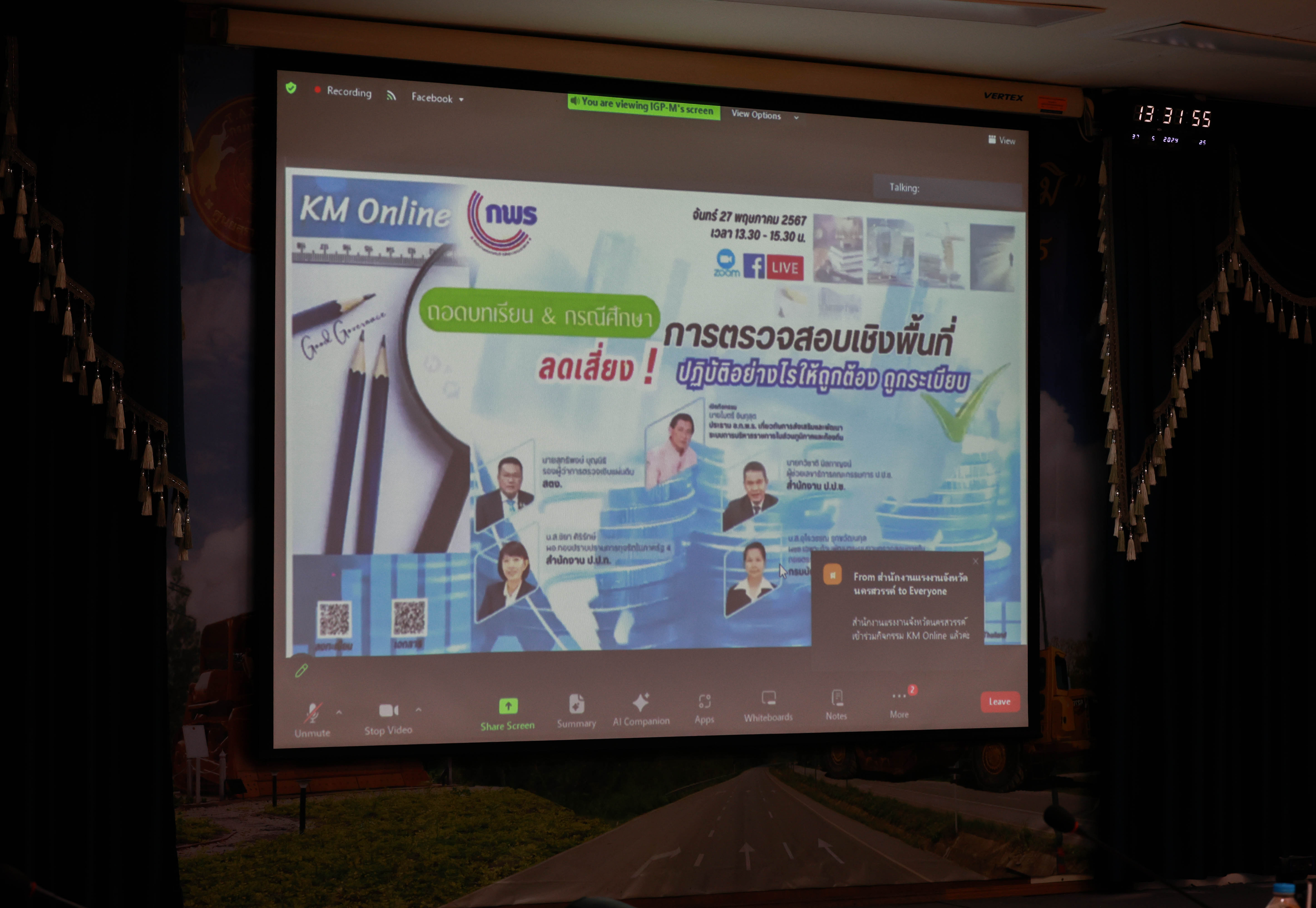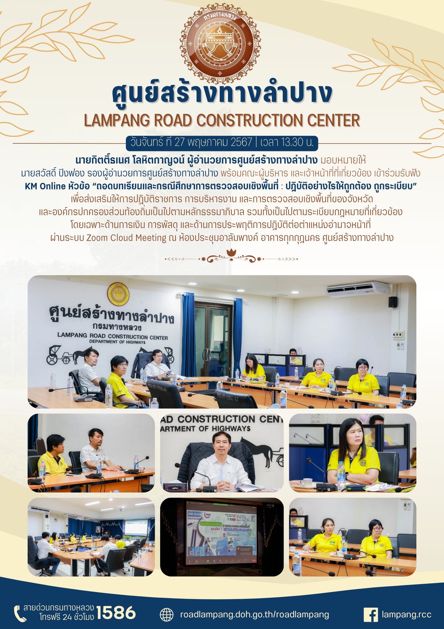นายกิตติ์ธเนศ โลหิตกาญจน์ ผู้อำนวยการศูนย์สร้างทางลำปาง มอบหมายให้ นายสวัสดิ์ ปิงฟอง รองผู้อำนวยการศูนย์สร้างทางลำปาง พร้อมคณะผู้บริหาร และเจ้าหน้าที่ที่เกี่ยวข้อง เข้าร่วมรับฟัง KM Online หัวข้อ “ถอดบทเรียนและกรณีศึกษาการตรวจสอบเชิงพื้นที่ : ปฎิบัติอย่างไรให้ถูกต้อง ถูกระเบียบ” เพื่อส่งเสริมให้การปฎิบัติราชการ การบริหารงาน และการตรวจสอบเชิงพื้นที่ของจังหวัดและองค์กรปกครองส่วนท้องถิ่นเป็นไปตามหลักธรรมาภิบาล รวมทั้งเป็นไปตามระเบียบกฎหมายที่เกี่ยวข้อง โดยเฉพาะด้านการเงิน การพัสดุ และด้านการประพฤติการปฎิบัติต่อตำแหน่งอำนาจหน้าที่ ผ่านระบบ Zoom Cloud Meeting ณ ห้องประชุมอาลัมพางค์ อาคารกุกกุฎนคร ศูนย์สร้างทางลำปาง