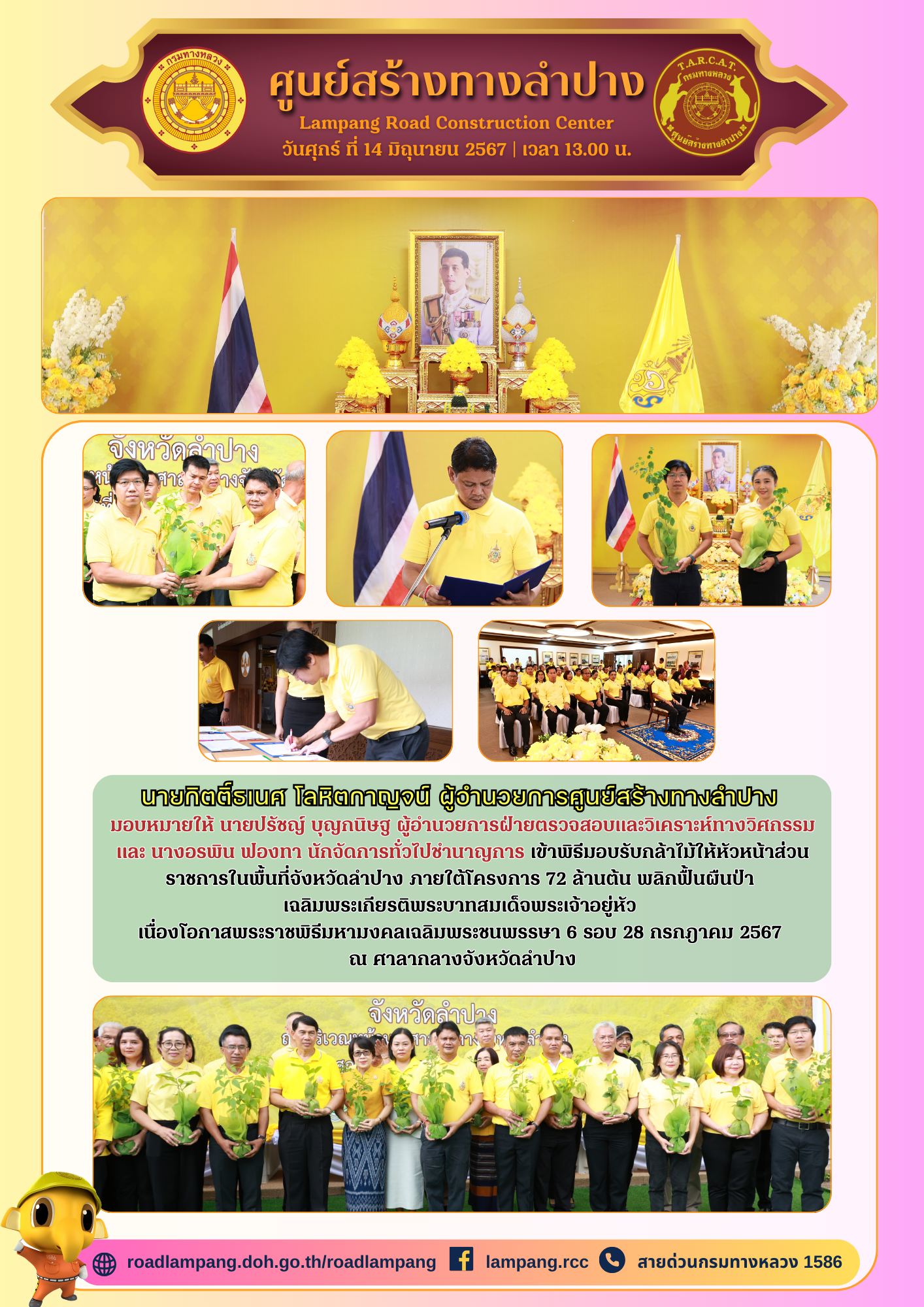 นายกิตติ์ธเนศ โลหิตกาญจน์ ผู้อำนวยการศูนย์สร้างทางลำปาง มอบหมายให้ นายปรัชญ์ บุญกนิษฐ ผู้อำนวยการฝ่ายตรวจสอบและวิเคราะห์ทางวิศกรรม และ นางอรพิน ฟองทา นักจัดการทั่วไปชำนาญการ เข้าพิธีมอบรับกล้าไม้ให้หัวหน้าส่วนราชการในพื้นที่จังหวัดลำปาง ภายใต้โครงการ 72 ล้านต้น พลิกฟื้นผืนป่า เฉลิมพระเกียรติพระบาทสมเด็จพระเจ้าอยู่หัว เนื่องโอกาสพระราชพิธีมหามงคลเฉลิมพระชนพรรษา 6 รอบ 28 กรกฎาคม 2567