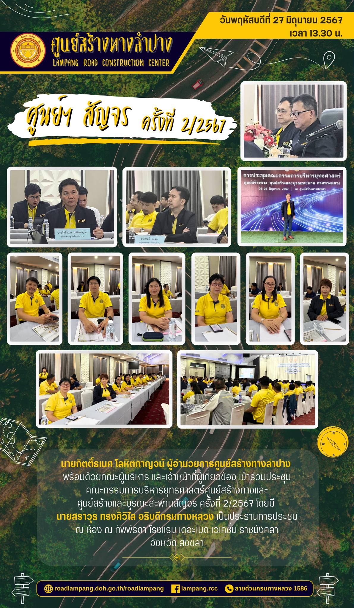นายกิตติ์ธเนศ โลหิตกาญจน์ ผู้อำนวยการศูนย์สร้างทางลำปาง พร้อมด้วยคณะผู้บริหาร และเจ้าหน้าที่ผู้เกี่ยวข้อง เข้าร่วมประชุมคณะกรรมการบริหารยุทธศาสตร์ศูนย์สร้างทางและศูนย์สร้างและบูรณะสะพานสัญจร ครั้งที่ 2/2567 โดยมี นายสราวุธ ทรงศิวิไล อธิบดีกรมทางหลวง เป็นประธานการประชุม ณ ห้อง ณ ทัพพ์รดา โรงแรม เดอะเบด เวเคชั่น ราชมังคลาจังหวัด สงขลา