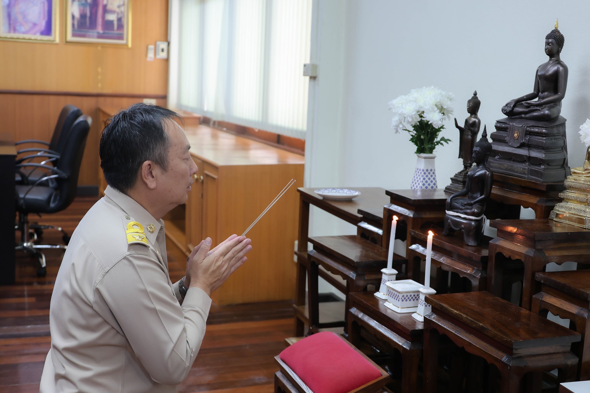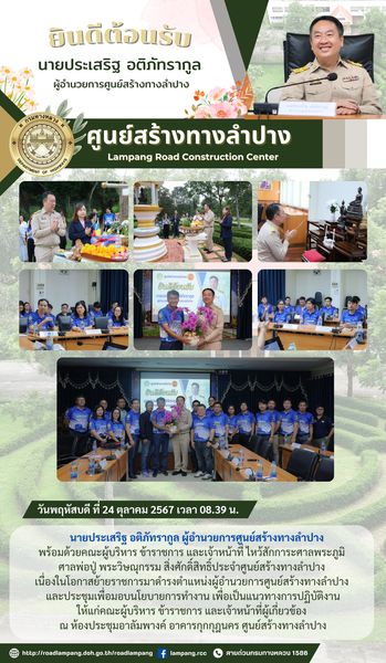 นายประเสริฐ อติภัทรากูล ผู้อำนวยการศูนย์สร้างทางลำปาง พร้อมด้วยคณะผู้บริหาร ข้าราชการ และเจ้าหน้าที่ ไหว้สักการะศาลพระภูมิ ศาลพ่อปู่ พระวิษณุกรรม สิ่งศักดิ์สิทธิ์ประจำศูนย์สร้างทางลำปาง เนื่องในโอกาสย้ายราชการมาดำรงตำแหน่งผู้อำนวยการศูนย์สร้างทางลำปาง และประชุมเพื่อมอบนโยบายการทำงาน เพื่อเป็นแนวทางการปฏิบัติงานให้แก่คณะผู้บริหาร ข้าราชการ และเจ้าหน้าที่ผู้เกี่ยวข้อง ณ ห้องประชุมอาลัมพางค์ อาคารกุกกุฎนคร ศูนย์สร้างทางลำปาง