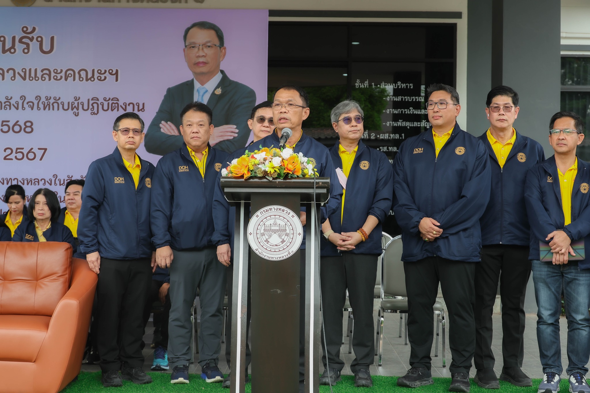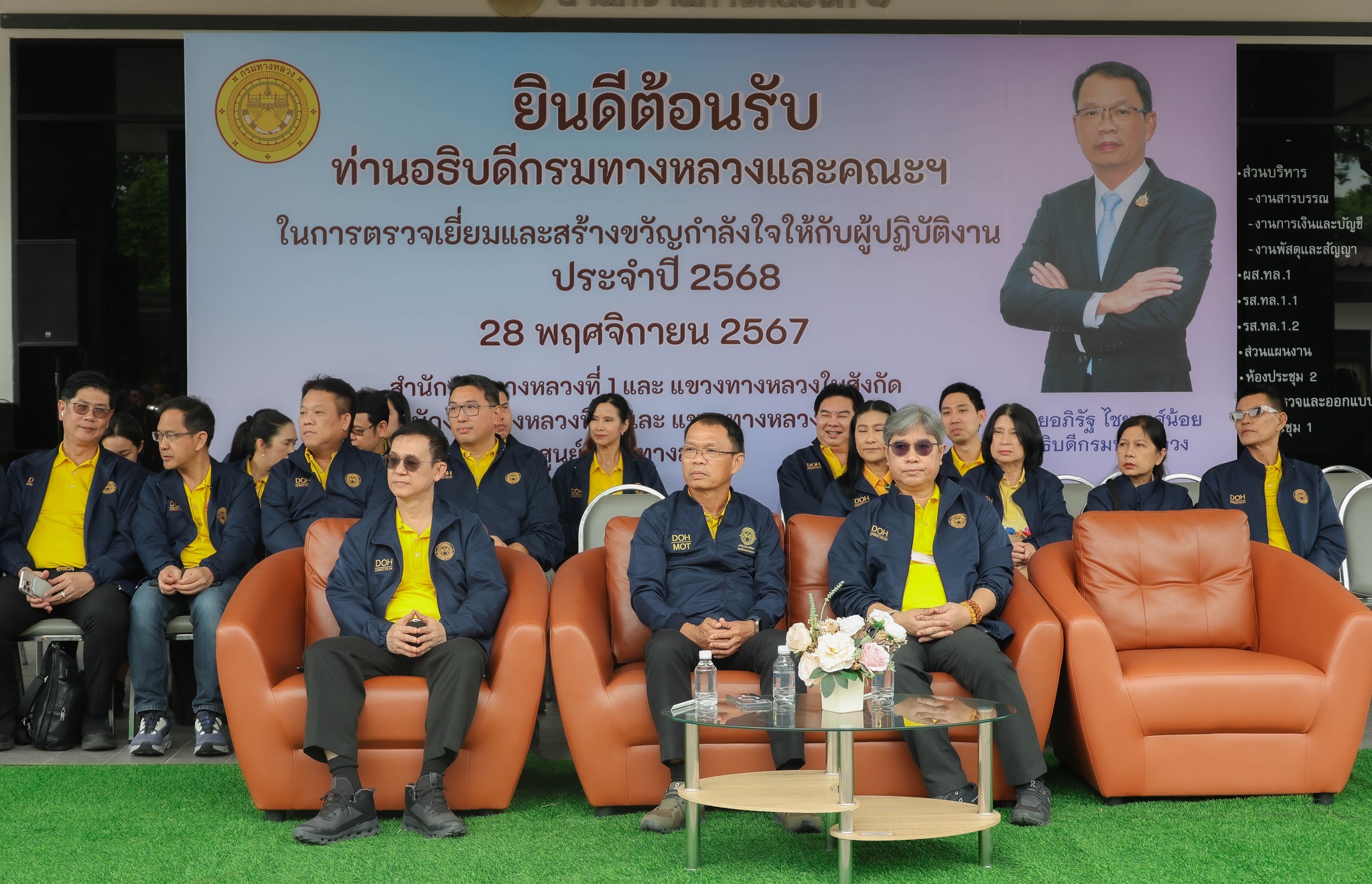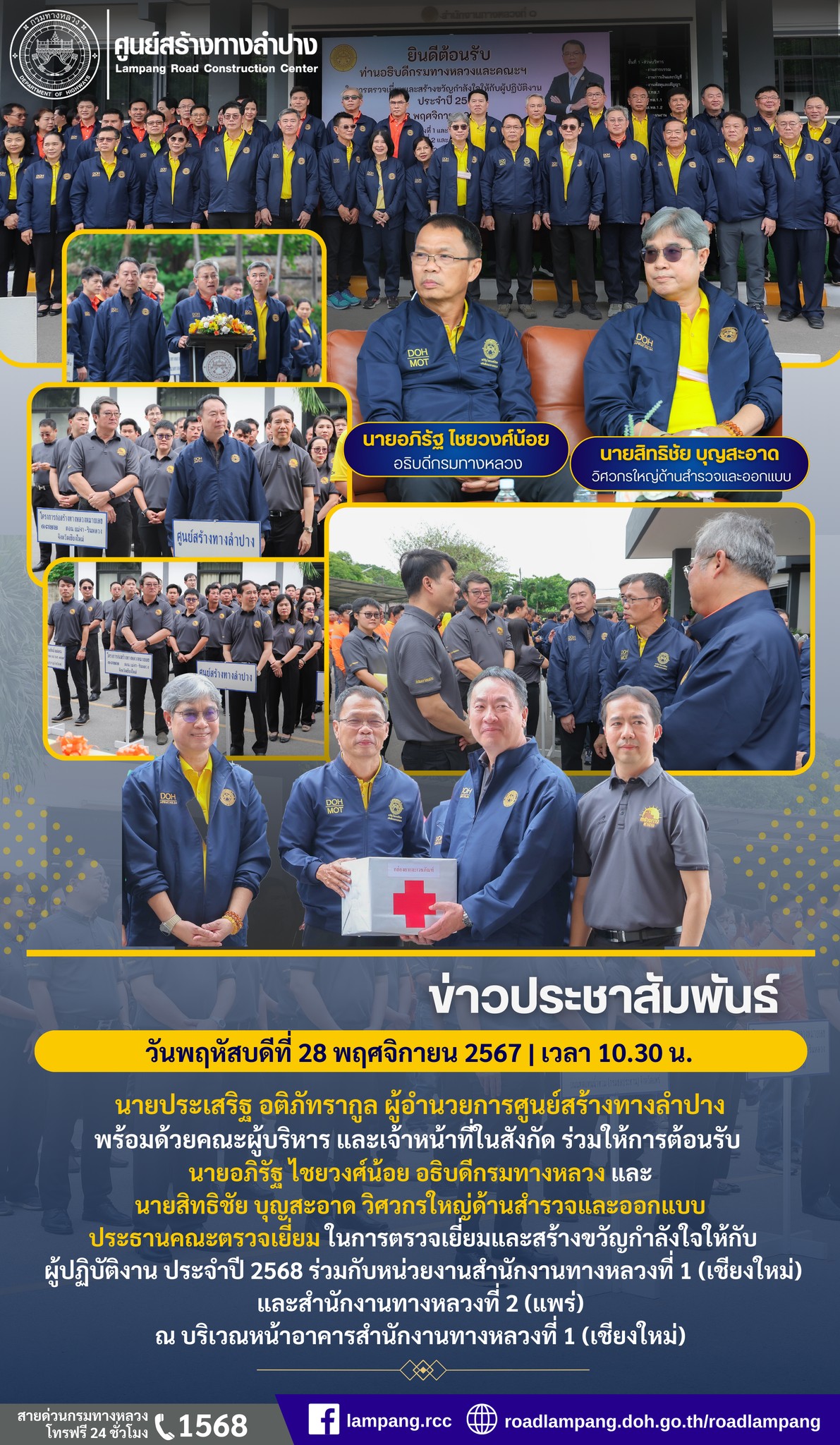 นายประเสริฐ อติภัทรากูล ผู้อำนวยการศูนย์สร้างทางลำปาง พร้อมด้วยคณะผู้บริหาร และเจ้าหน้าที่ในสังกัด ร่วมให้การต้อนรับ นายอภิรัฐ ไชยวงศ์น้อย อธิบดีกรมทางหลวง และนายสิทธิชัย บุญสะอาด วิศวกรใหญ่ด้านสำรวจและออกแบบ ประธานคณะตรวจเยี่ยม ในการตรวจเยี่ยมและสร้างขวัญกำลังใจให้กับผู้ปฏิบัติงาน ประจำปี 2568 ร่วมกับหน่วยงานสำนักงานทางหลวงที่ 1 (เชียงใหม่) และสำนักงานทางหลวงที่ 2 (แพร่) ณ บริเวณหน้าอาคารสำนักงานทางหลวงที่ 1 (เชียงใหม่)