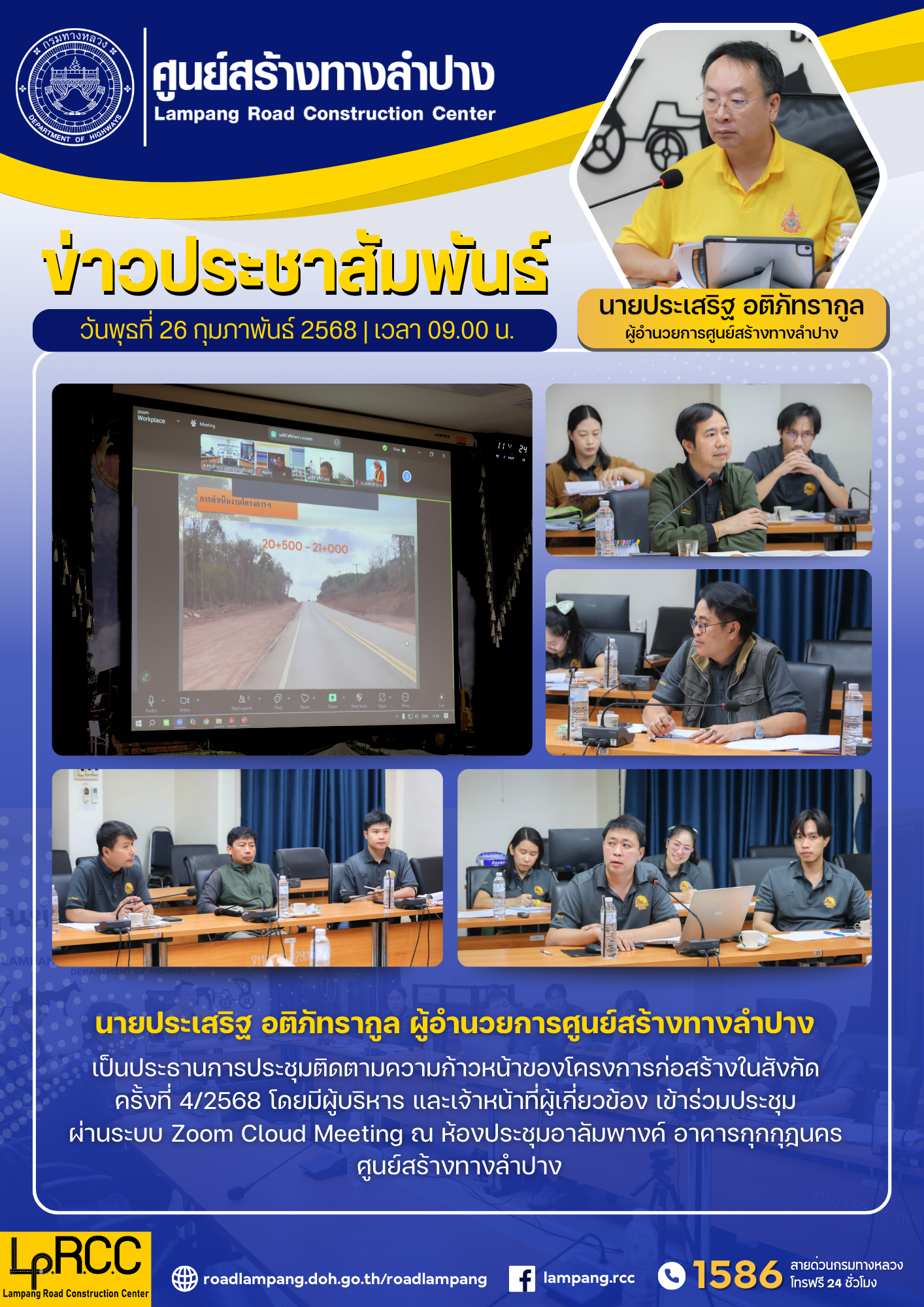 นายประเสริฐ อติภัทรากูล ผู้อำนวยการศูนย์สร้างทางลำปาง เป็นประธานการประชุมติดตามความก้าวหน้าของโครงการก่อสร้างในสังกัด ครั้งที่ 4/68 โดยมีผู้บริหาร และเจ้าหน้าที่ผู้เกี่ยวข้อง เข้าร่วมประชุม ผ่านระบบ Zoom Cloud Meeting ณ ห้องประชุมอาลัมพางค์ อาคารกุกกุฎนคร ศูนย์สร้างทางลำปาง