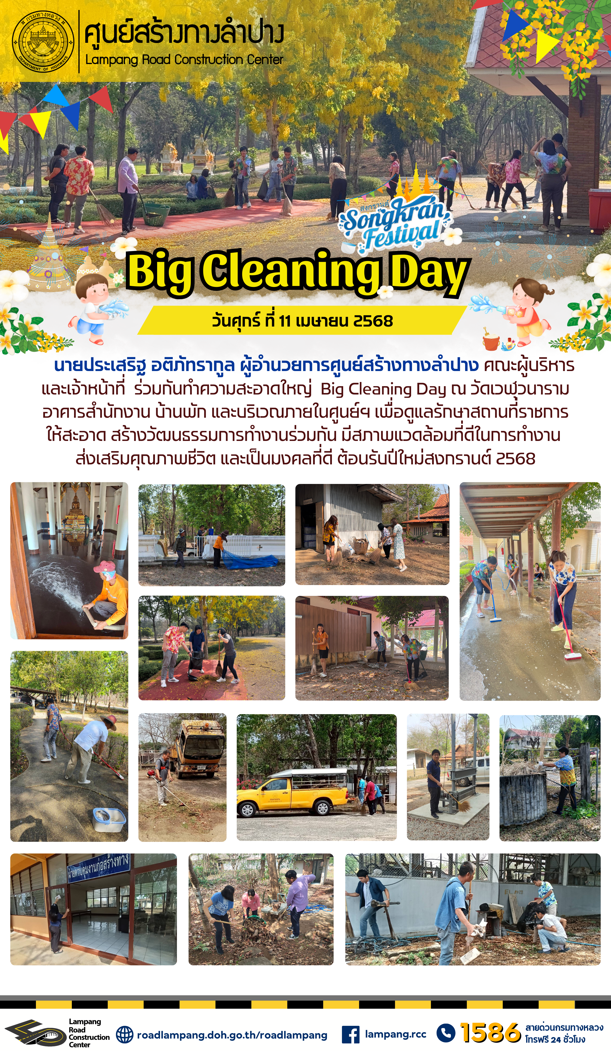 นายประเสริฐ อติภัทรากูล ผู้อำนวยการศูนย์สร้างทางลำปาง คณะผู้บริหาร และเจ้าหน้าที่ ร่วมกันทำความสะอาดใหญ่ Big Cleaning Day ณ วัดเวฬุวนาราม อาคารสำนักงาน บ้านพัก และบริเวณภายในศูนย์ฯ เพื่อดูแลรักษาสถานที่ราชการให้สะอาด สร้างวัฒนธรรมการทำงานร่วมกัน มีสภาพแวดล้อมที่ดีในการทำงาน ส่งเสริมคุณภาพชีวิต และเป็นมงคลที่ดี ต้อนรับปีใหม่สงกรานต์ 2568