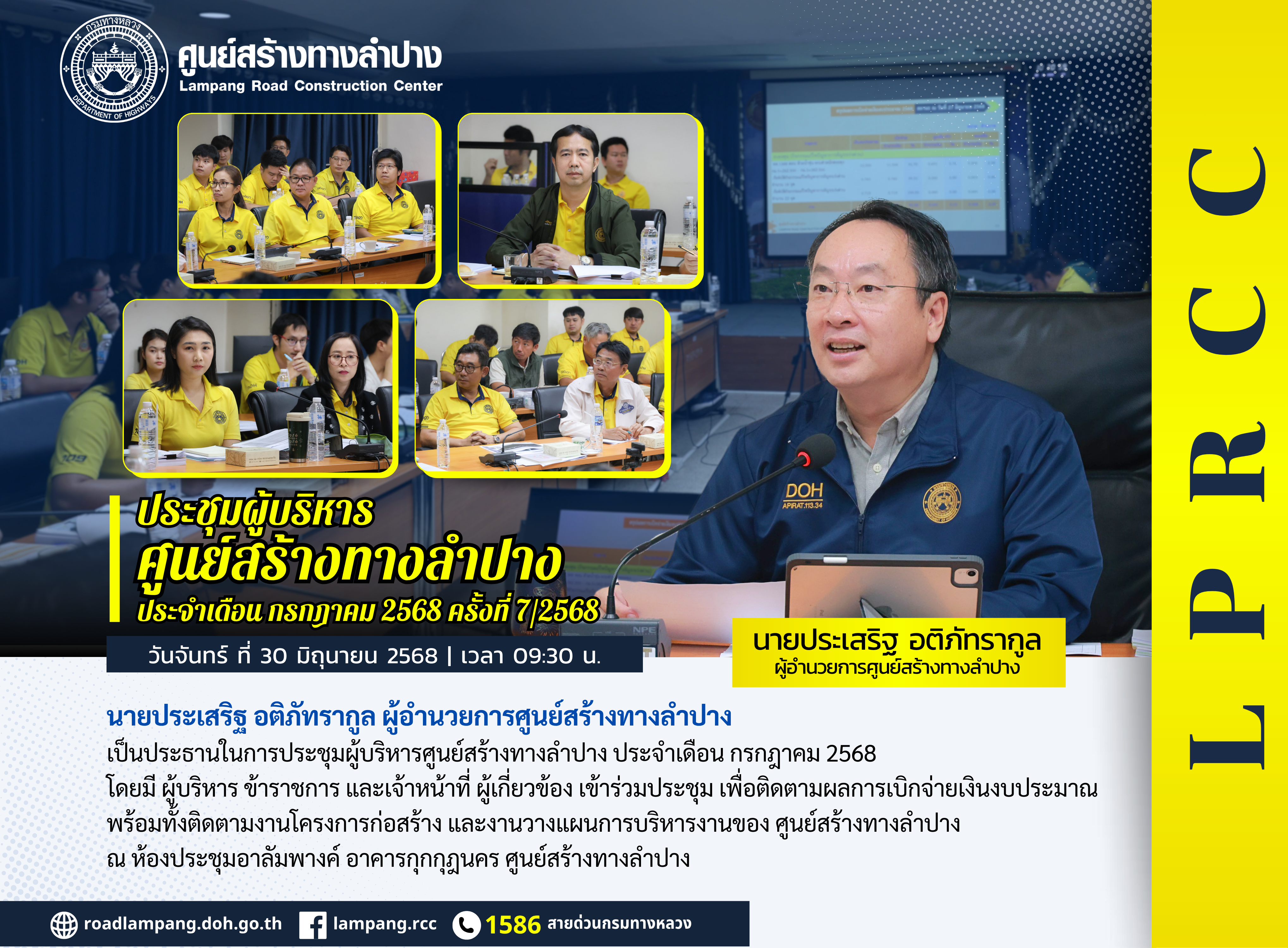 นายประเสริฐ อติภัทรากูล ผู้อำนวยการศูนย์สร้างทางลำปาง เป็นประธานในการประชุมผู้บริหารศูนย์สร้างทางลำปาง ประจำเดือน กรกฎาคม 2568 โดยมี ผู้บริหาร ข้าราชการ และเจ้าหน้าที่ ผู้เกี่ยวข้อง เข้าร่วมประชุม เพื่อติดตามผลการเบิกจ่ายเงินงบประมาณ พร้อมทั้งติดตามงานโครงการก่อสร้าง และงานวางแผนการบริหารงานของ ศูนย์สร้างทางลำปาง ณ ห้องประชุมอาลัมพางค์ อาคารกุกกุฎนคร ศูนย์สร้างทางลำปาง
