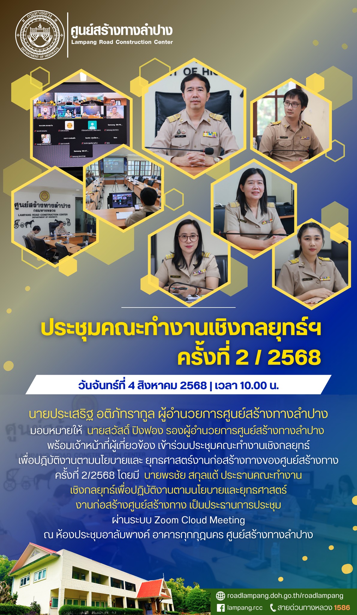 นายประเสริฐ อติภัทรากูล ผู้อำนวยการศูนย์สร้างทางลำปางมอบหมายให้ นายสวัสดิ์ ปิงฟอง รองผู้อำนวยการศูนย์สร้างทางลำปาง พร้อมเจ้าหน้าที่ผู้เกี่ยวข้อง เข้าร่วมประชุมคณะทำงานเชิงกลยุทธ์เพื่อปฎิบัติงานตามนโยบายและ ยุทธศาสตร์งานก่อสร้างทางของศูนย์สร้างทาง ครั้งที่ 2/2568 โดยมี นายพรชัย สกุลแต้ ประธานคณะทำงานเชิงกลยุทธ์เพื่อปฏิบัติงานตามนโยบายและยุทธศาสตร์งานก่อสร้างศูนย์สร้างทาง เป็นประธานการประชุม ผ่านระบบ Zoom Cloud Meeting ณ ห้องประชุมอาลัมพางค์ อาคารกุกกุฎนคร ศูนย์สร้างทางลำปาง