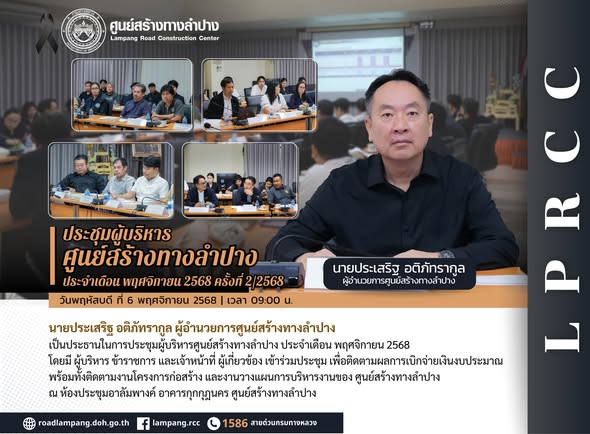 เป็นประธานในการประชุมผู้บริหารศูนย์สร้างทางลำปาง ประจำเดือน พฤศจิกายน 2568 โดยมี ผู้บริหาร ข้าราชการ และเจ้าหน้าที่ ผู้เกี่ยวข้อง เข้าร่วมประชุม เพื่อติดตามผลการเบิกจ่ายเงินงบประมาณ พร้อมทั้งติดตามงานโครงการก่อสร้าง และงานวางแผนการบริหารงานของ ศูนย์สร้างทางลำปาง ณ ห้องประชุมอาลัมพางค์ อาคารกุกกุฎนคร ศูนย์สร้างทางลำปาง