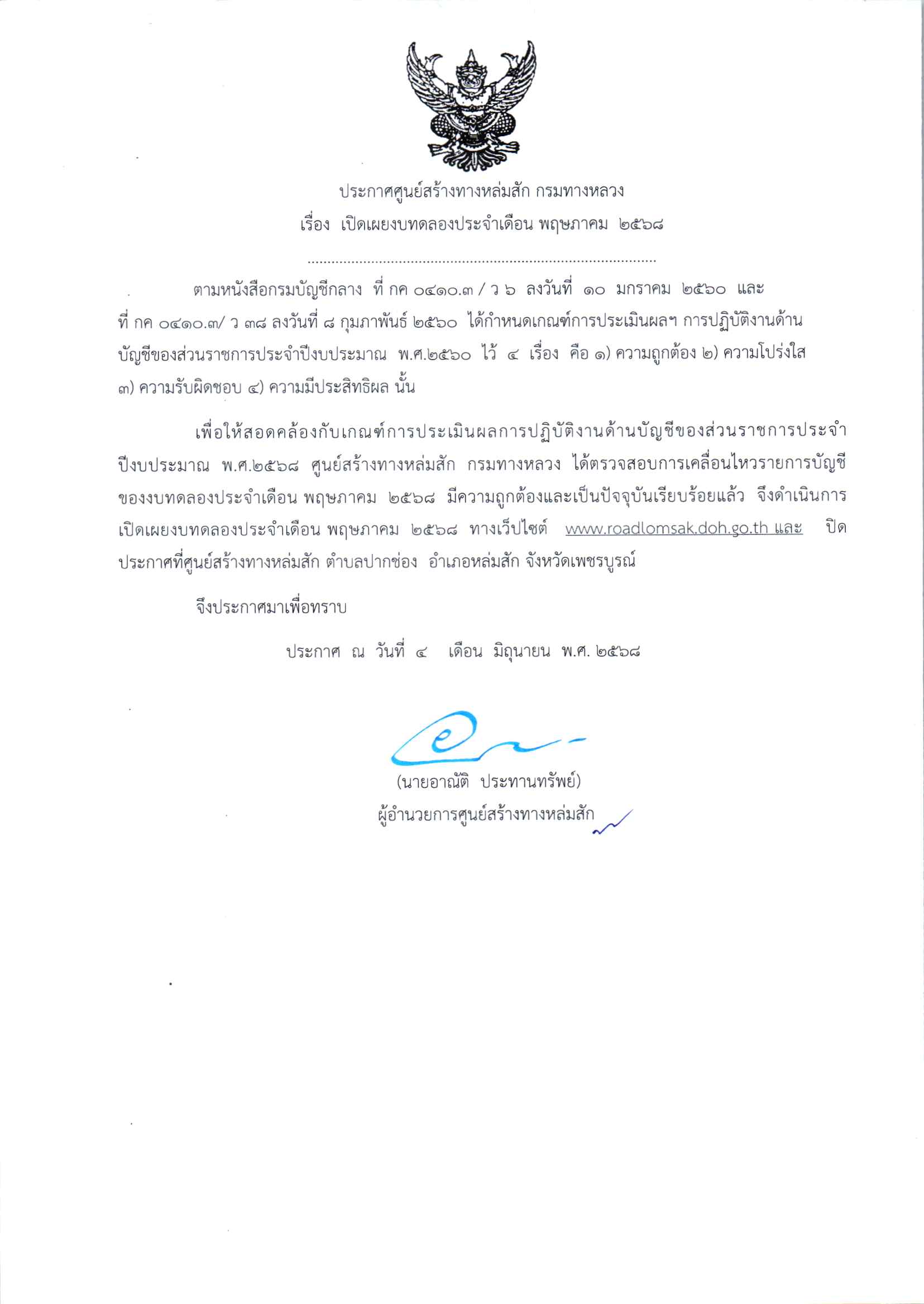 ประกาศเปิดเผยงบทดลองประจำเดือน พฤษภาคม 2568 ปีงบประมาณ 2568