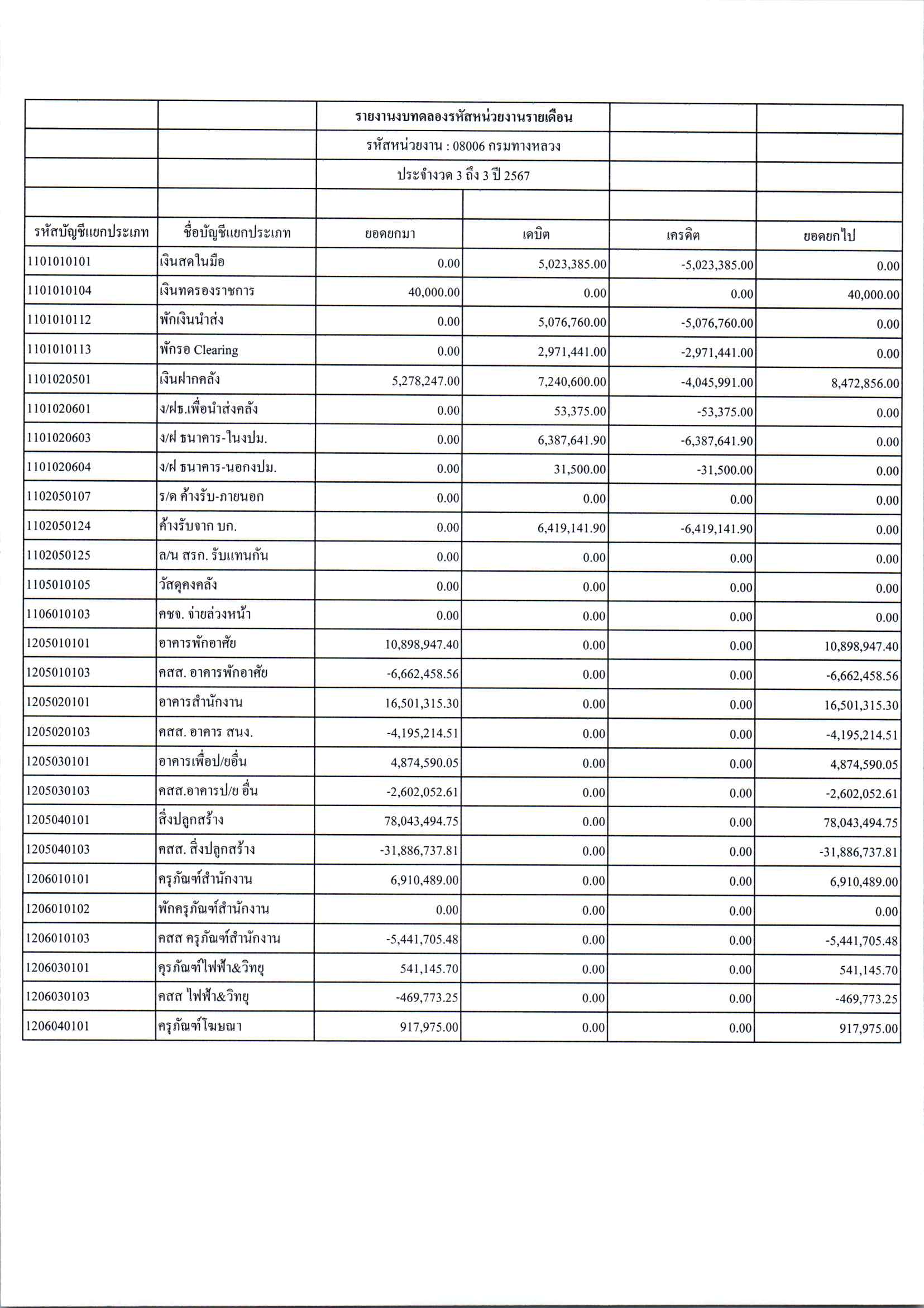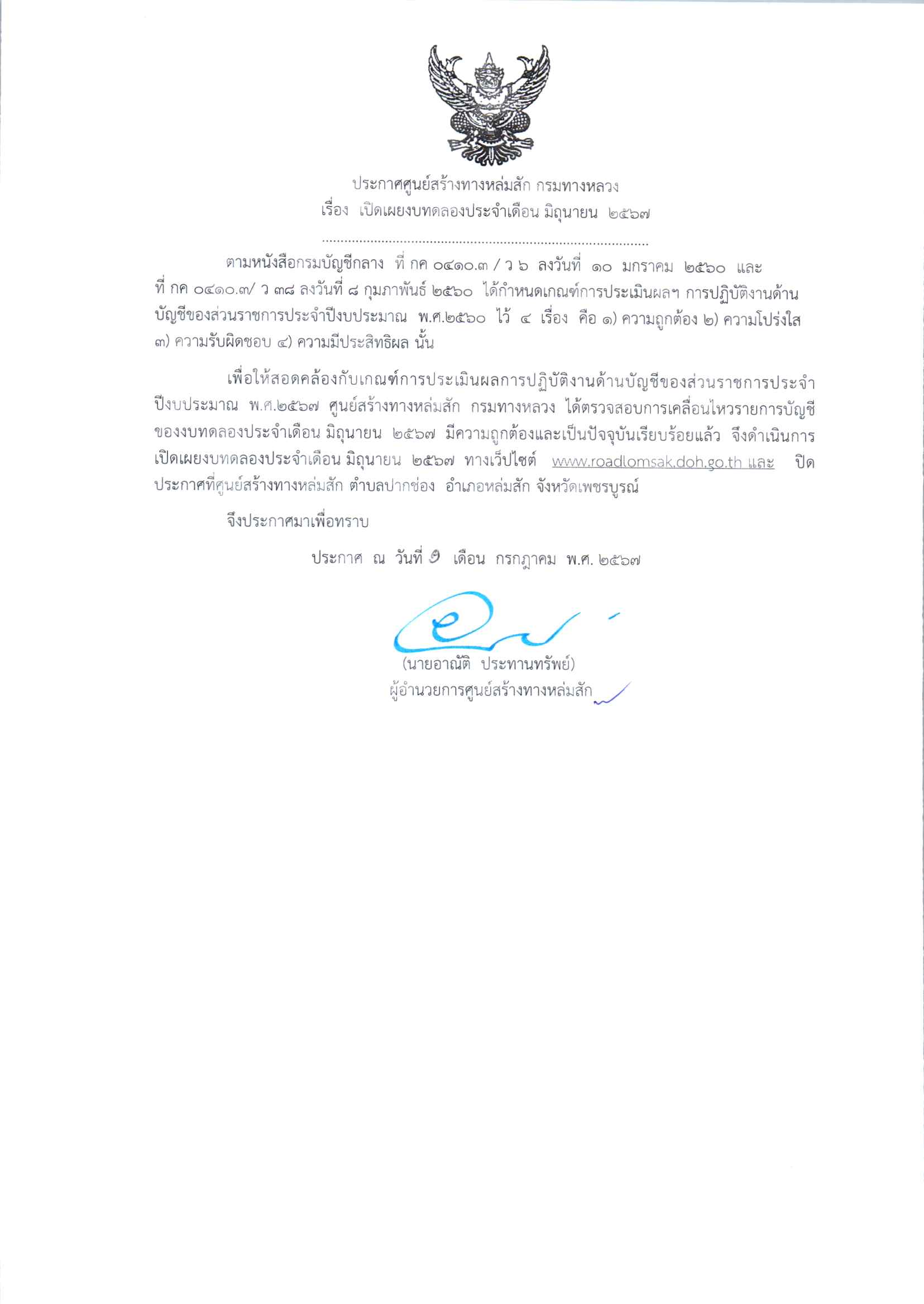 ประกาศเปิดเผยงบทดลองประจำเดือน มิถุนายน 2567 ปีงบประมาณ 2567