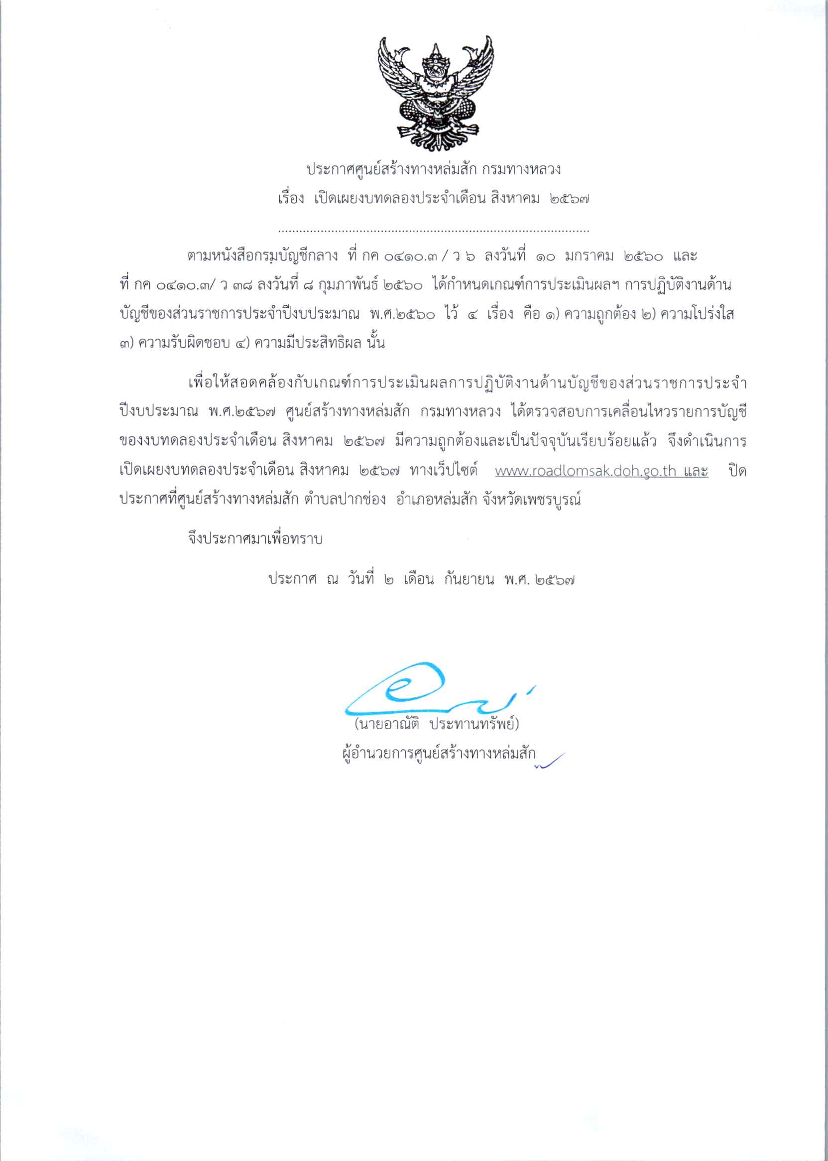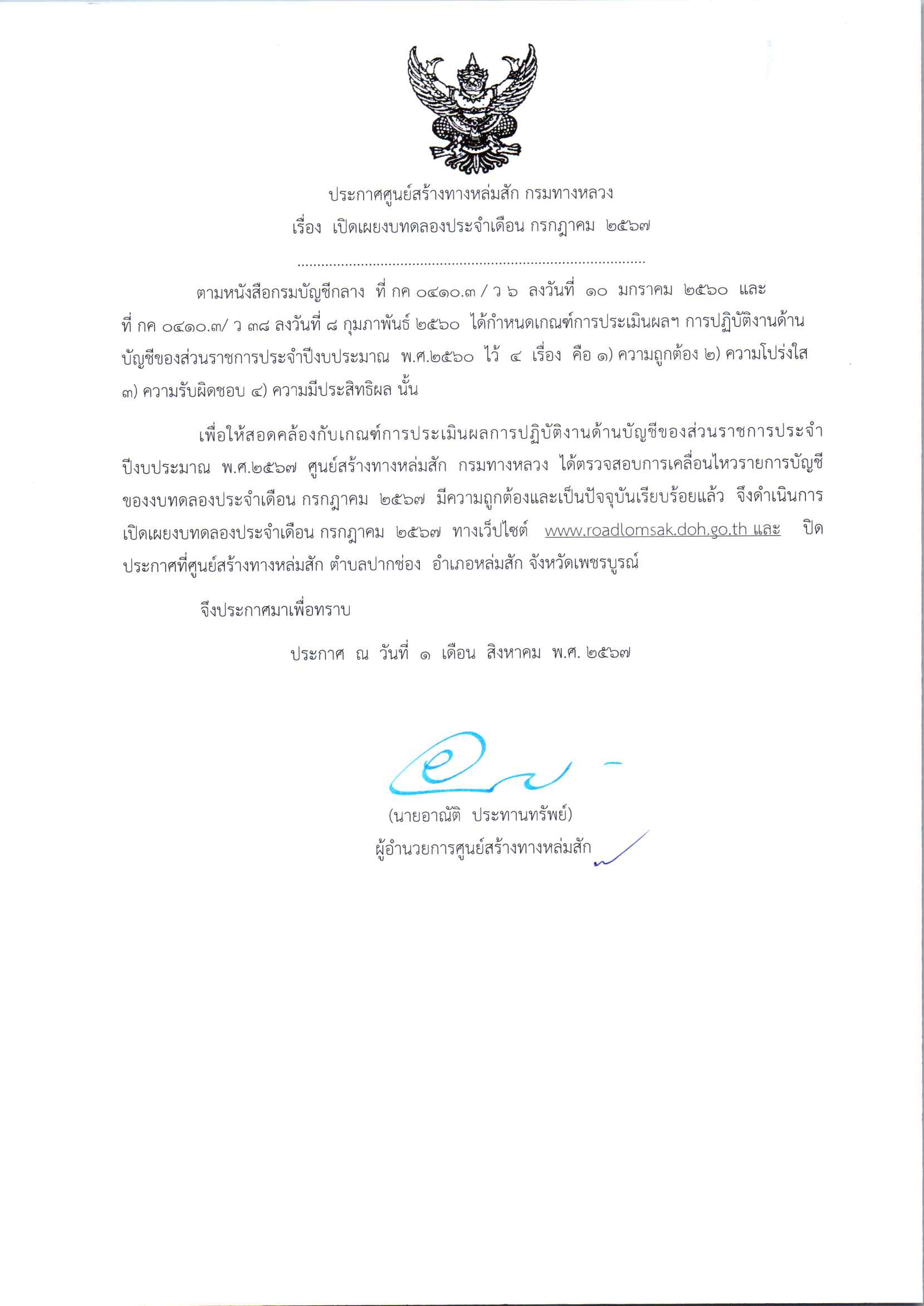 ประกาศเปิดเผยงบทดลองประจำเดือน สิงหาคม 2567 ปีงบประมาณ 2567