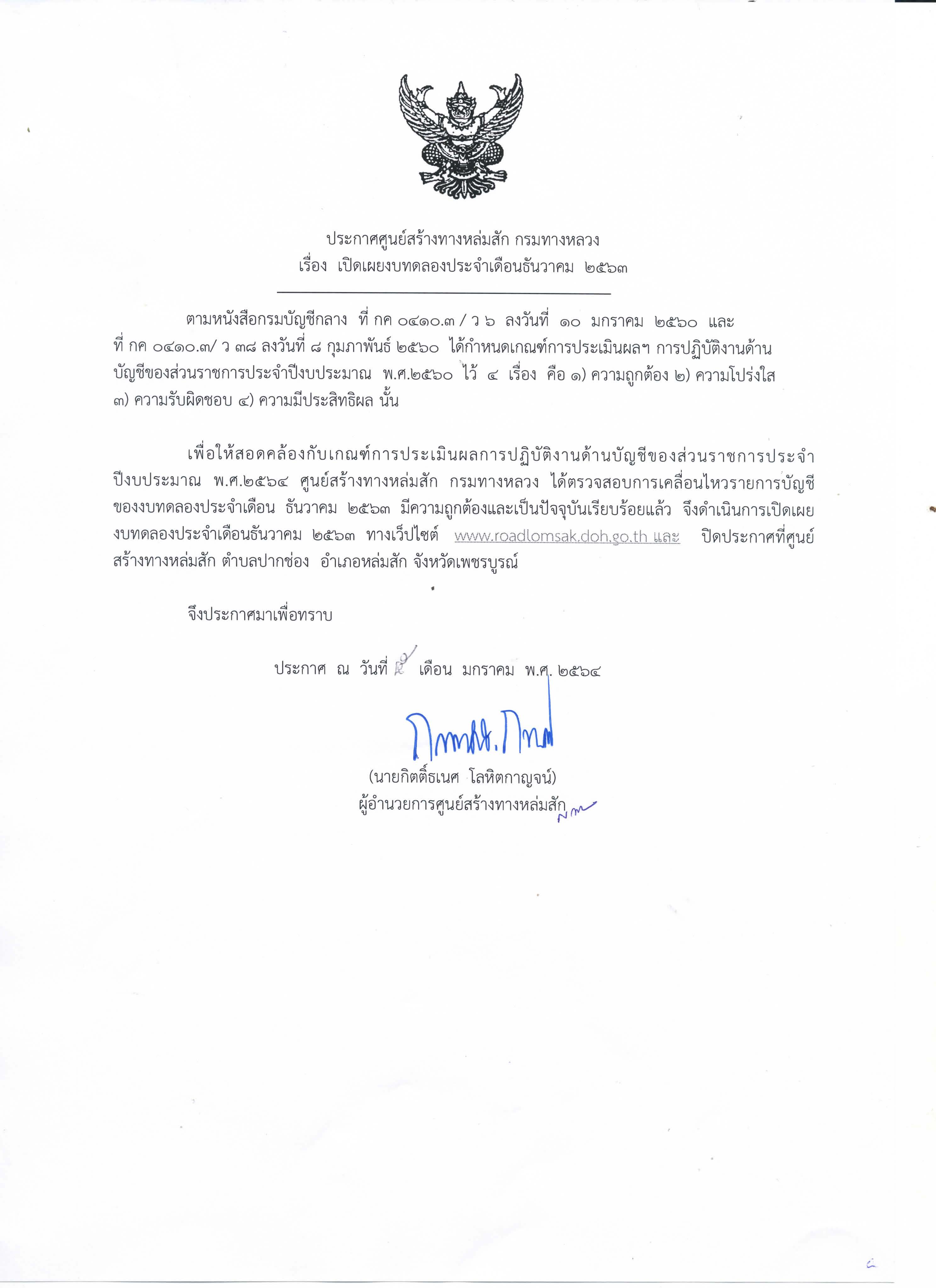 ประกาศเปิดเผยงบทดลองประจำเดือน ธันวาคม 2563