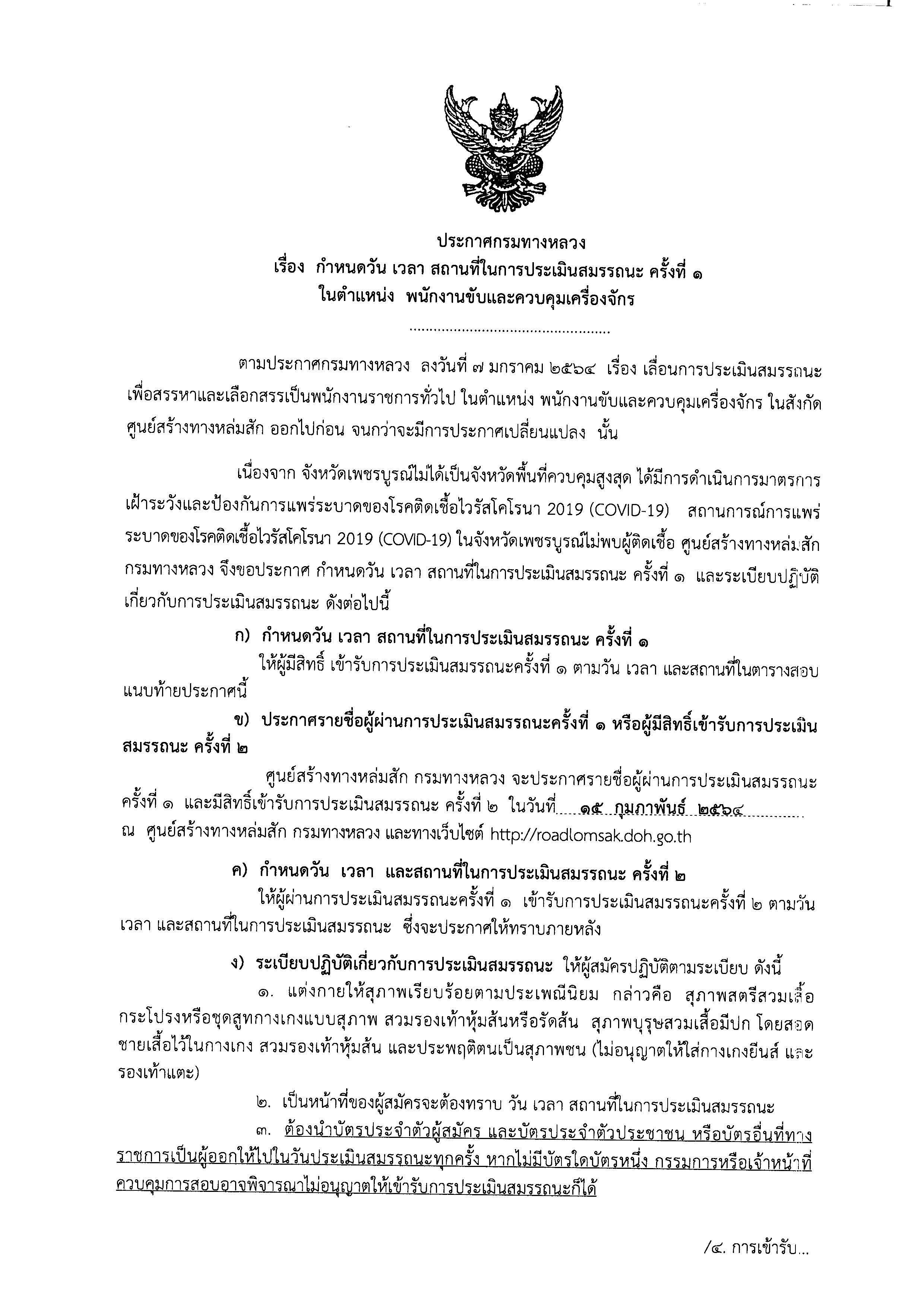กำหนดวัน เวลา วถานที่ในการประเมินสมรรถนะ ครั้งที่ 1 ในตำแหน่ง พนักงานขับและควบคุมเครื่องจักร
