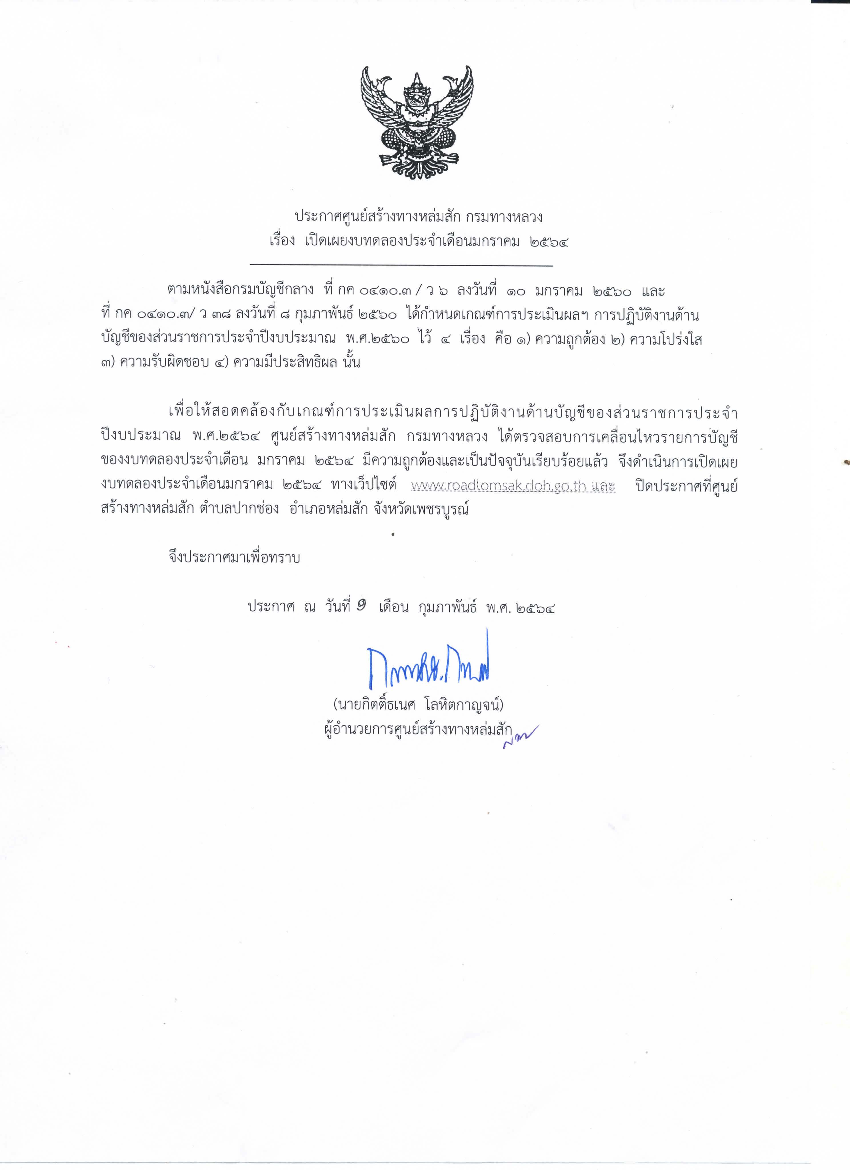 ประกาศเปิดเผยงบทดลองประจำเดือน มกราคม 2564