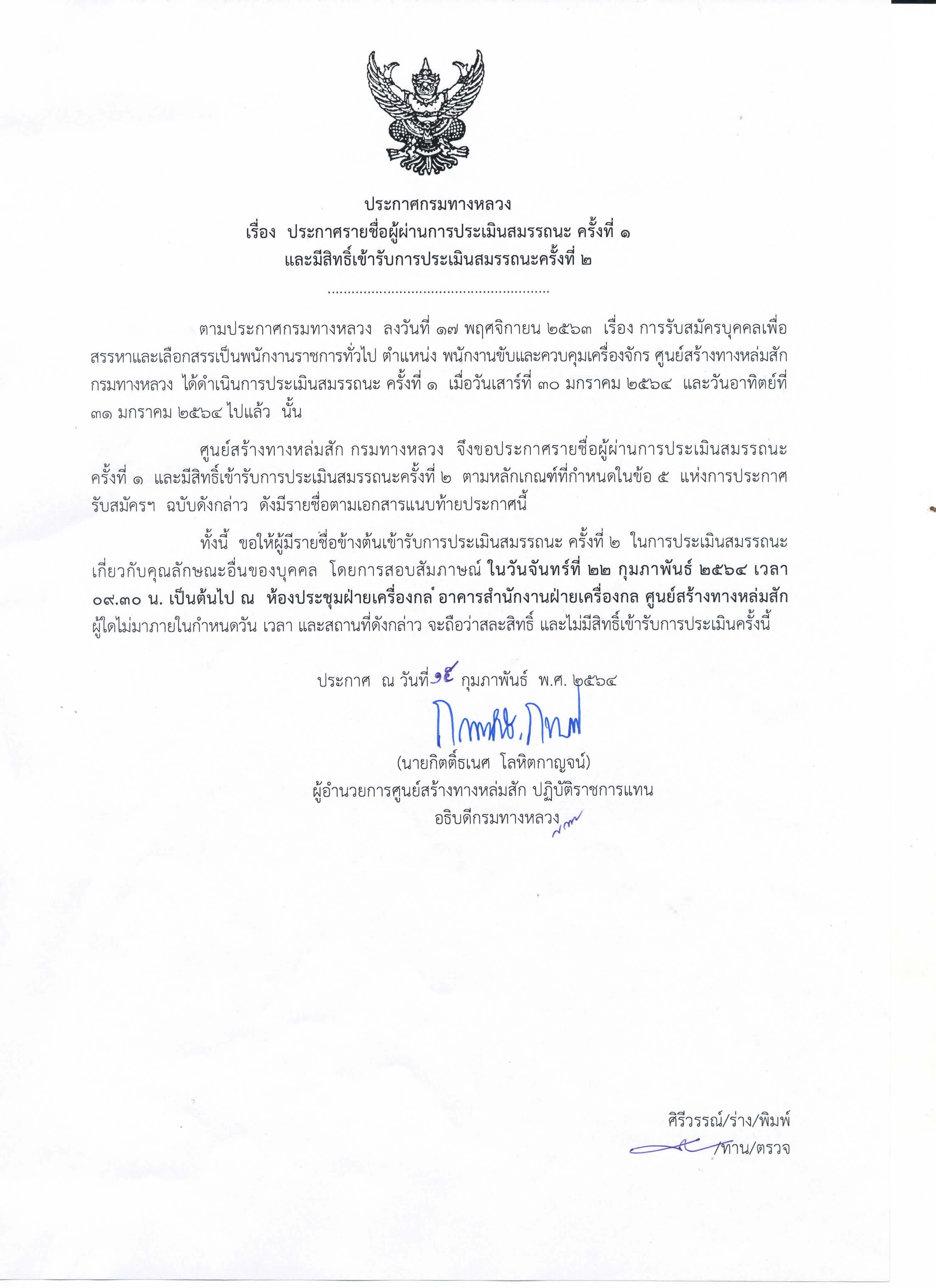 ประกาศรายชื่อผู้ผ่านการประเมินสมรรถนะ ครั้งที่ 1 และมีสิทธิเข้ารับการประเมินสมรรถนะ ครั้งที่ 2