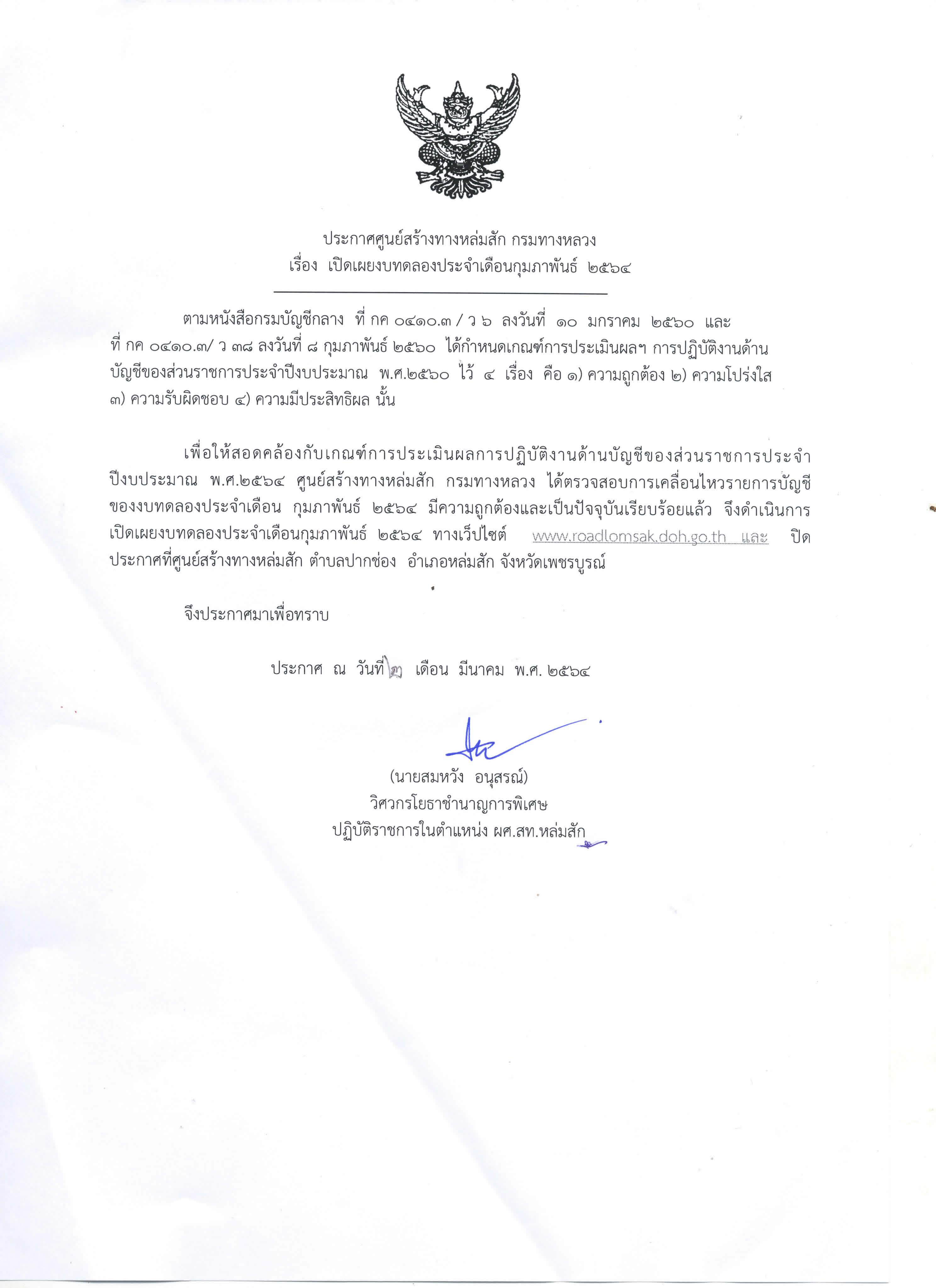 ประกาศเปิดเผยงบทดลองประจำเดือน กุมภาพันธ์ 2564