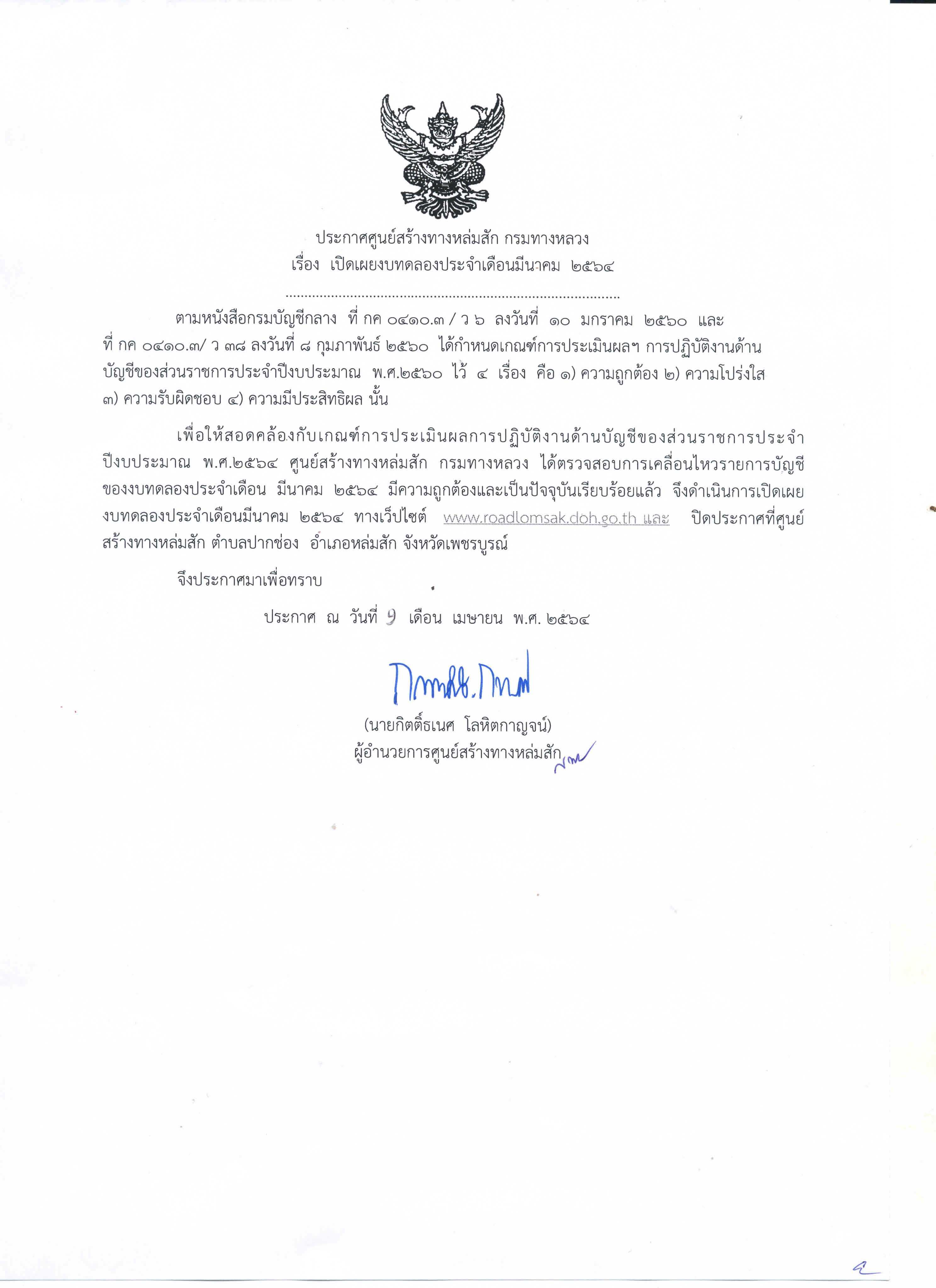 ประกาศเปิดเผยงบทดลองประจำเดือน มีนาคม 2564