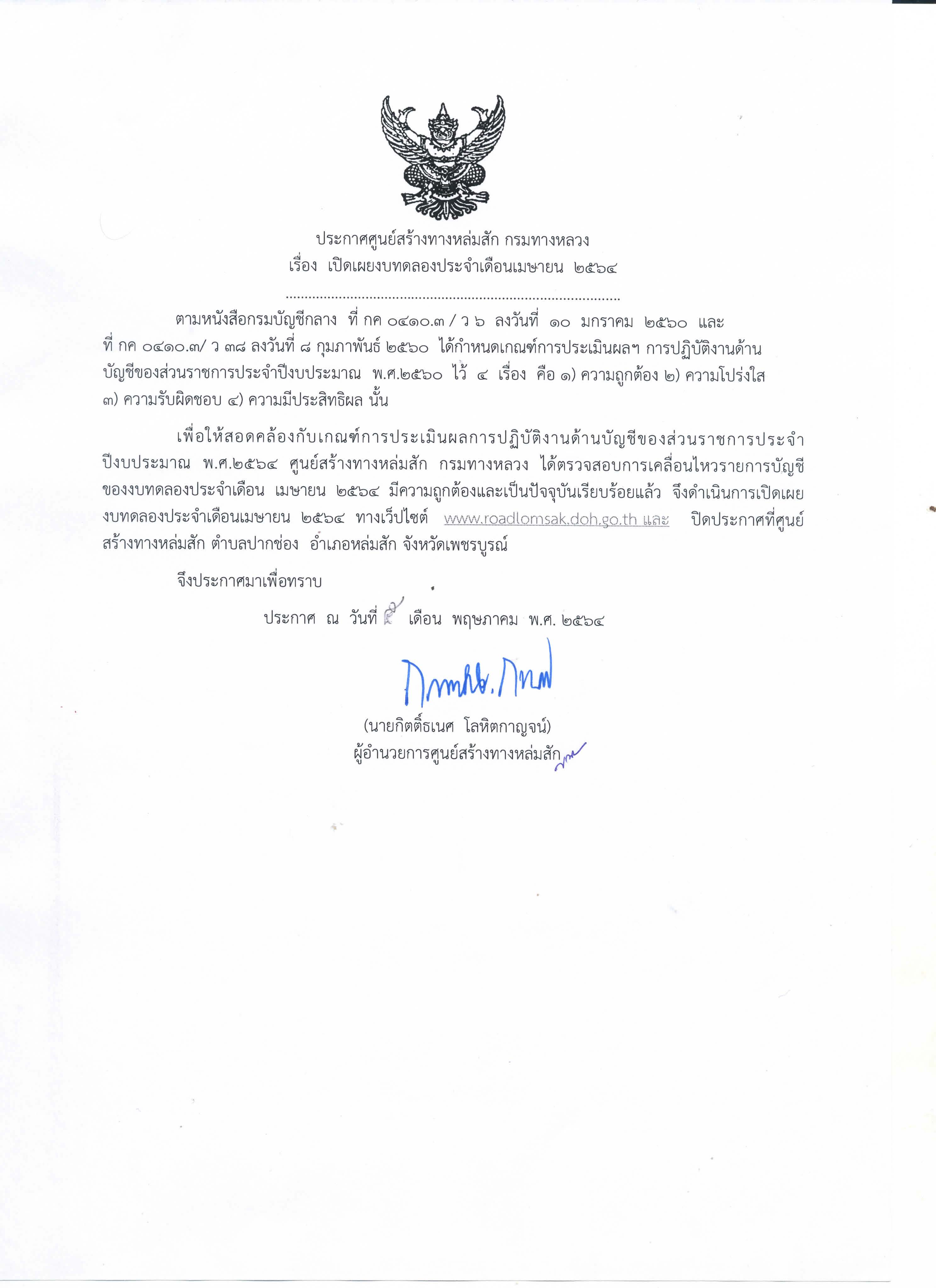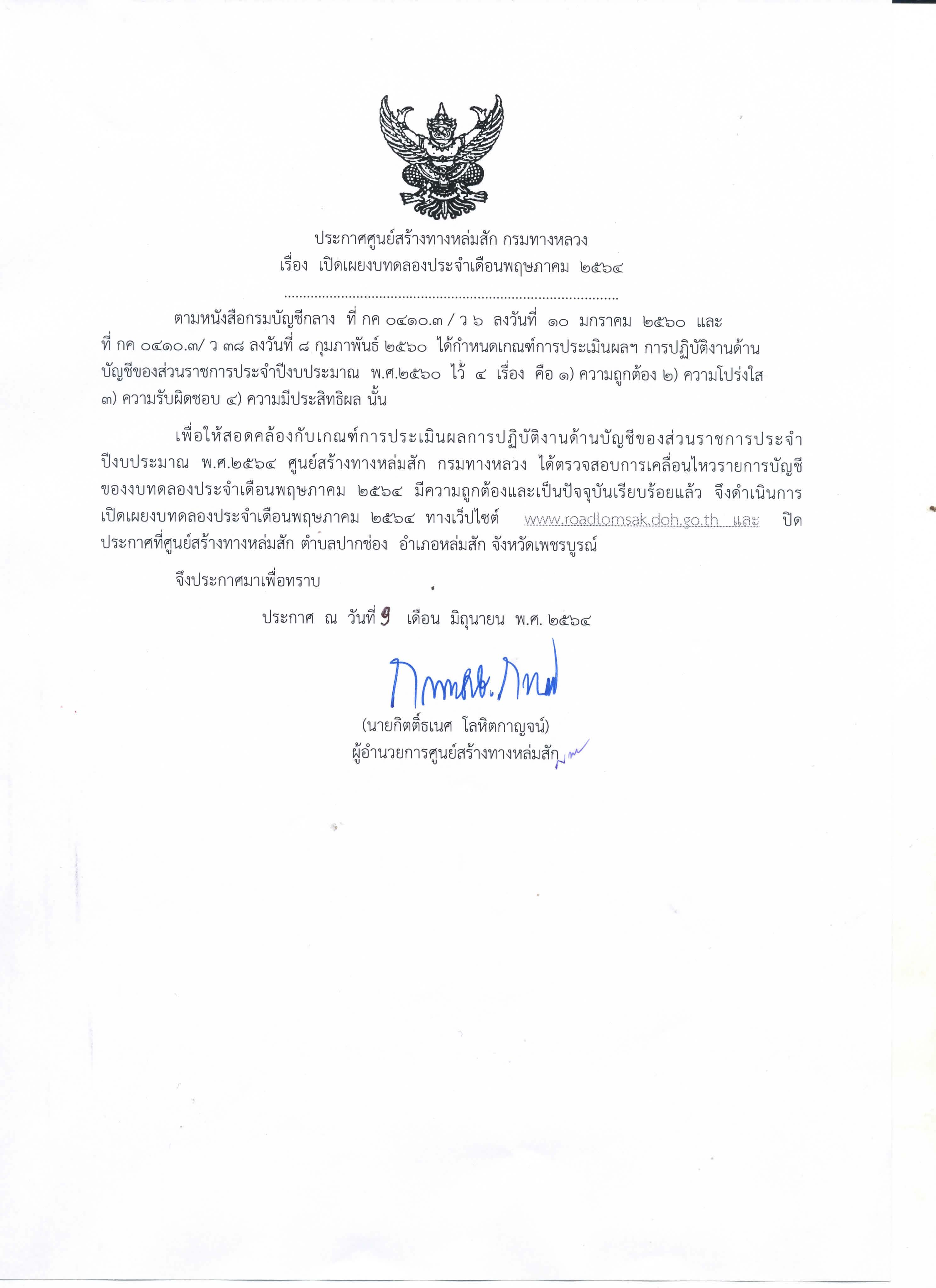 ประกาศเปิดเผยงบทดลองประจำเดือน พฤษภาคม 2564