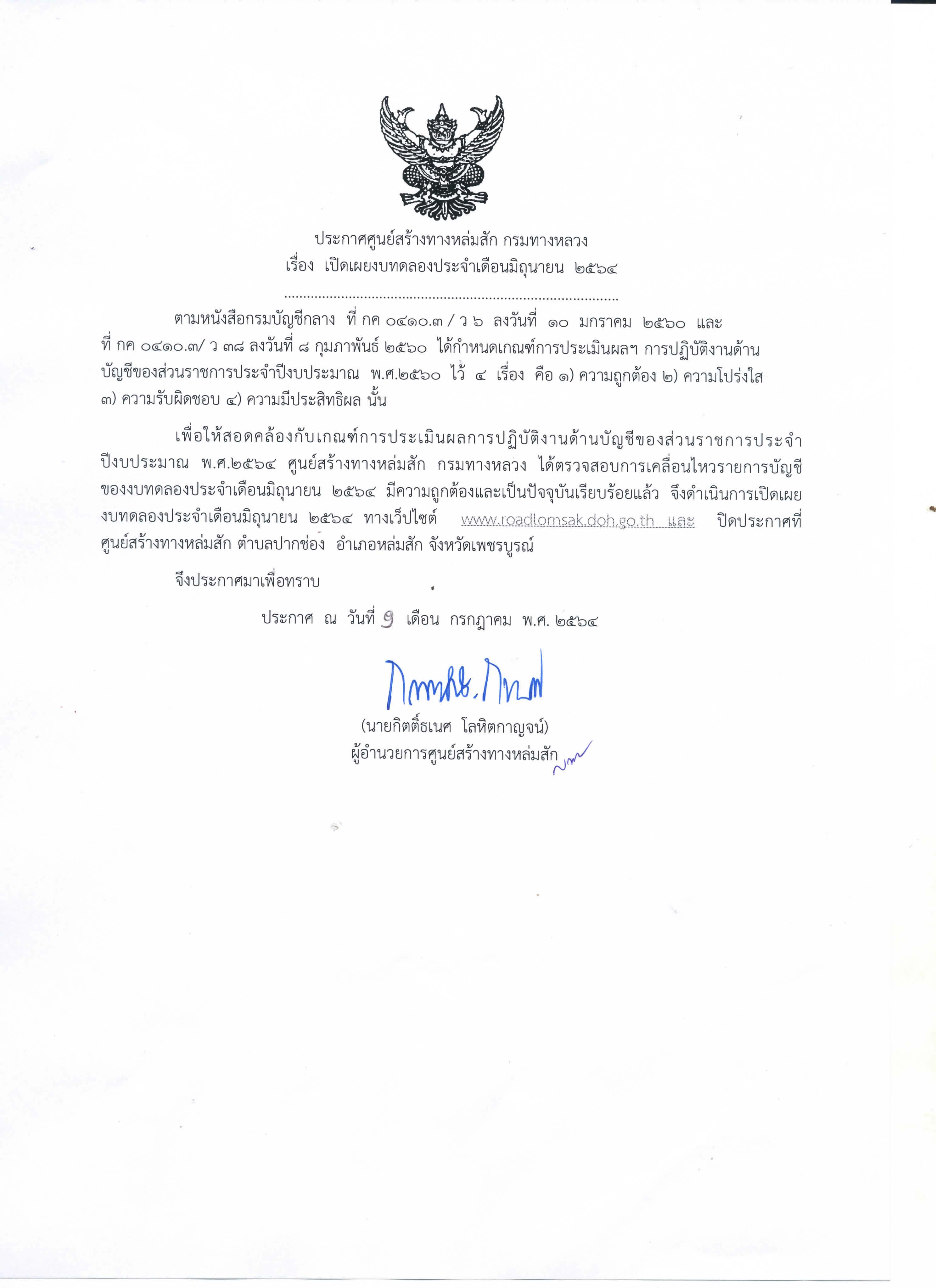 ประกาศเปิดเผยงบทดลองประจำเดือน กรกฎาคม 2564