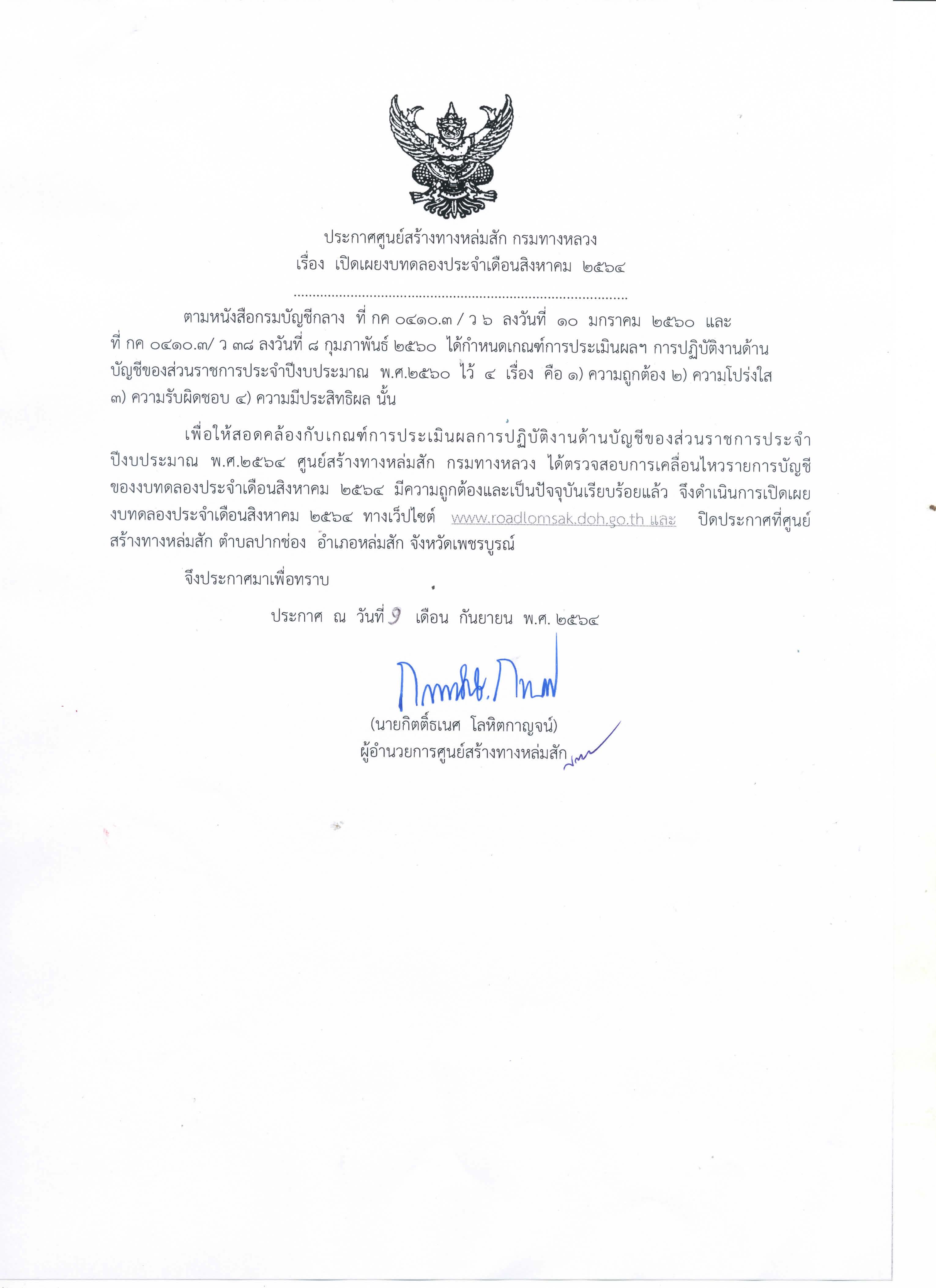 ประกาศเปิดเผยงบทดลองประจำเดือน สิงหาคม 2564