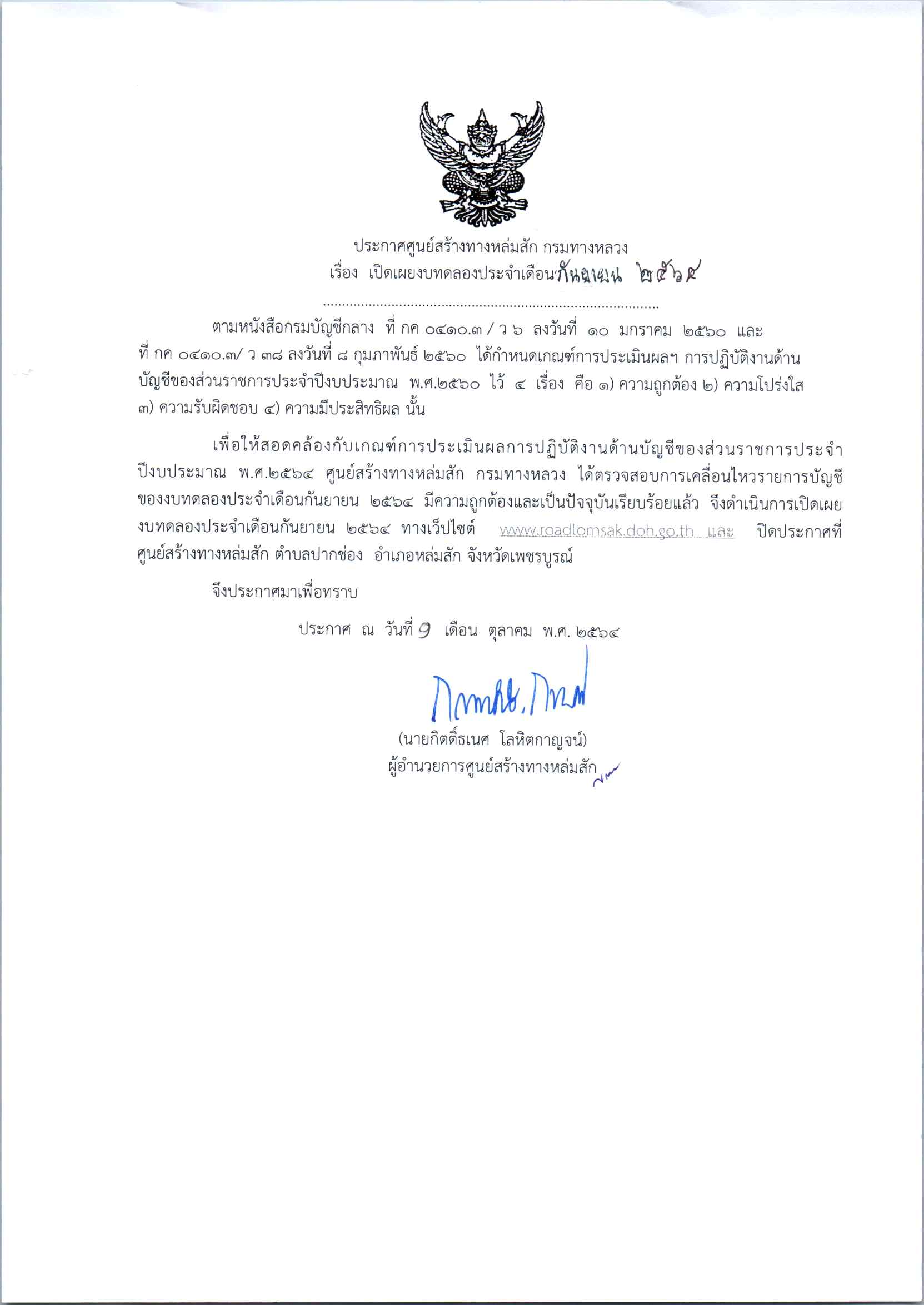 ประกาศเปิดเผยงบทดลองประจำเดือน กันยายน 2564 และรายระเอียดประกอบรายการบัญชีที่สำคัญของงบทดลอง ณ วันที่ 30 กันยายน 2564