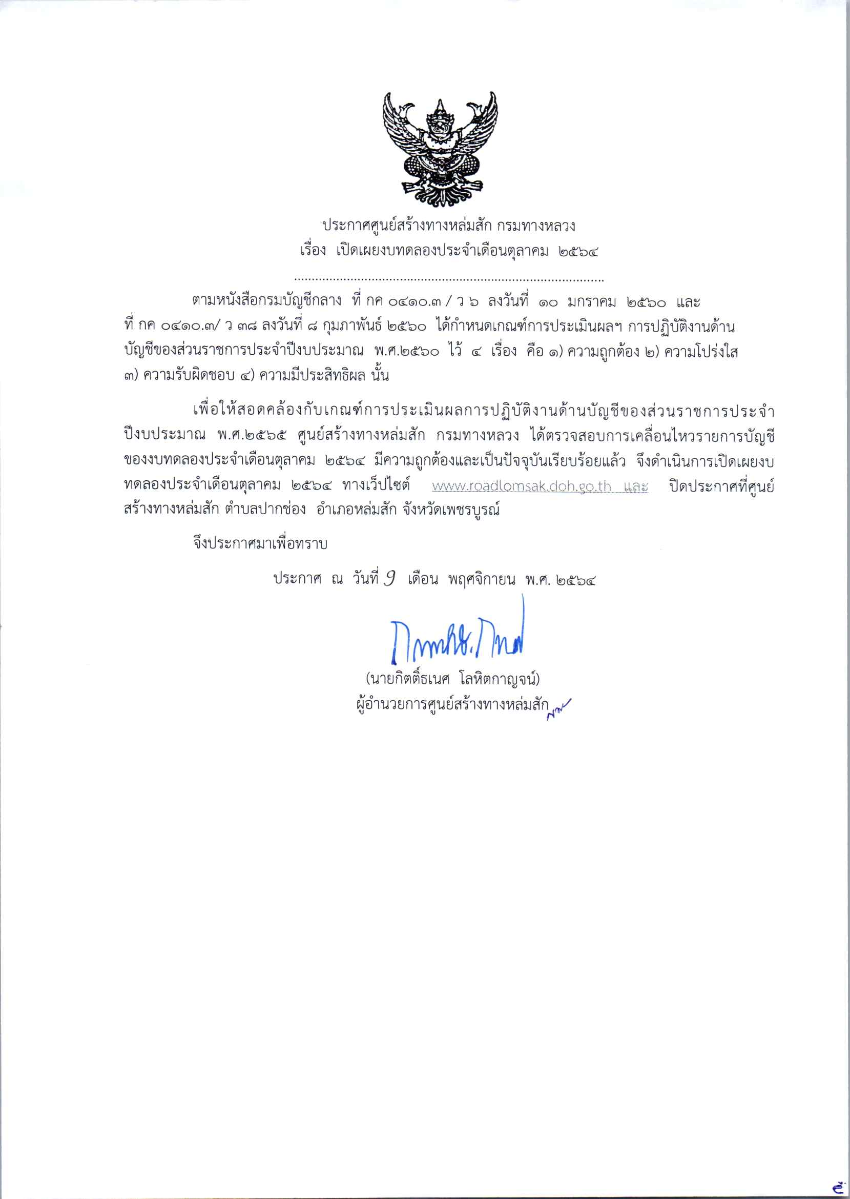 ประกาศเปิดเผยงบทดลองประจำเดือน ตุลาคม 2564