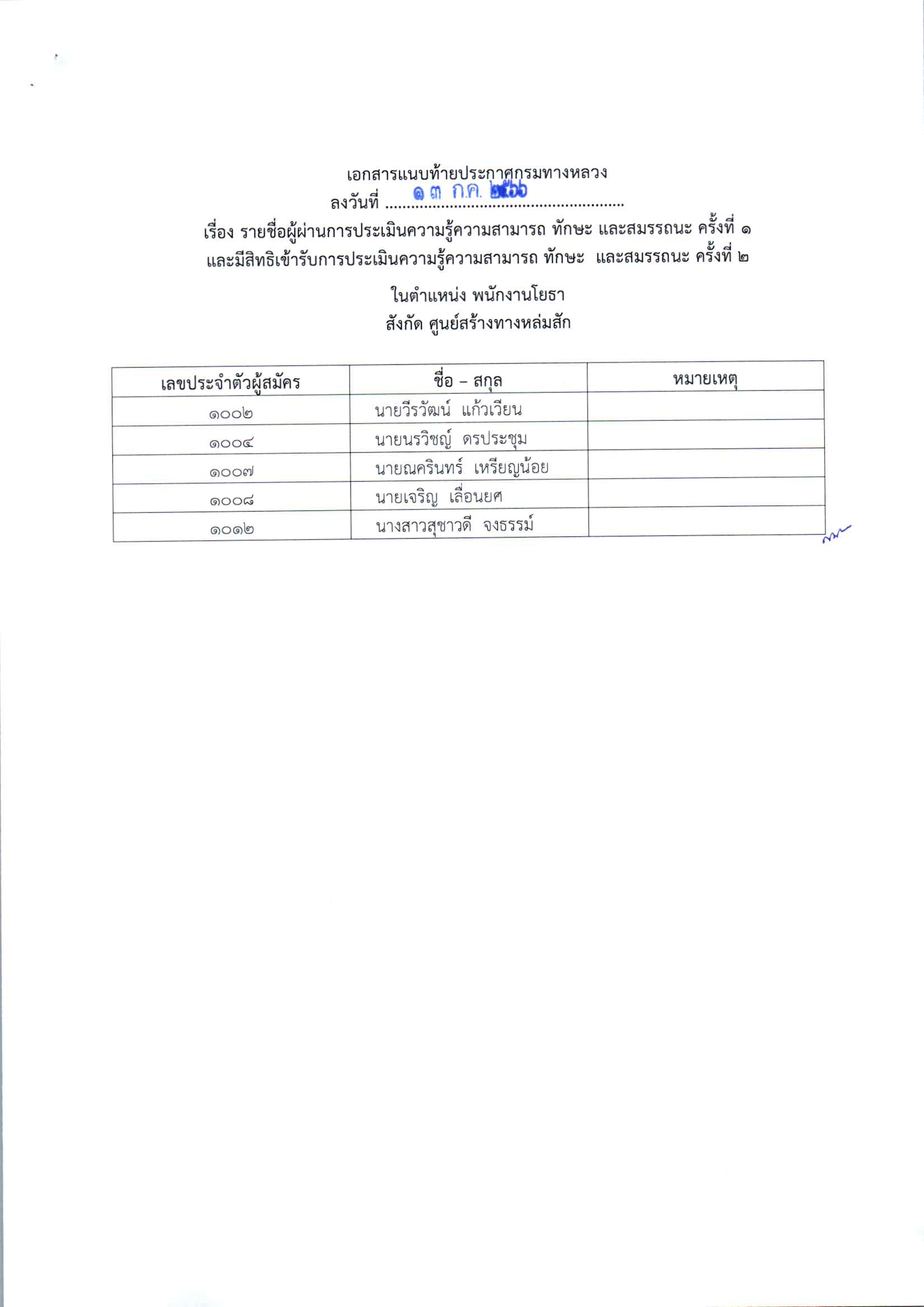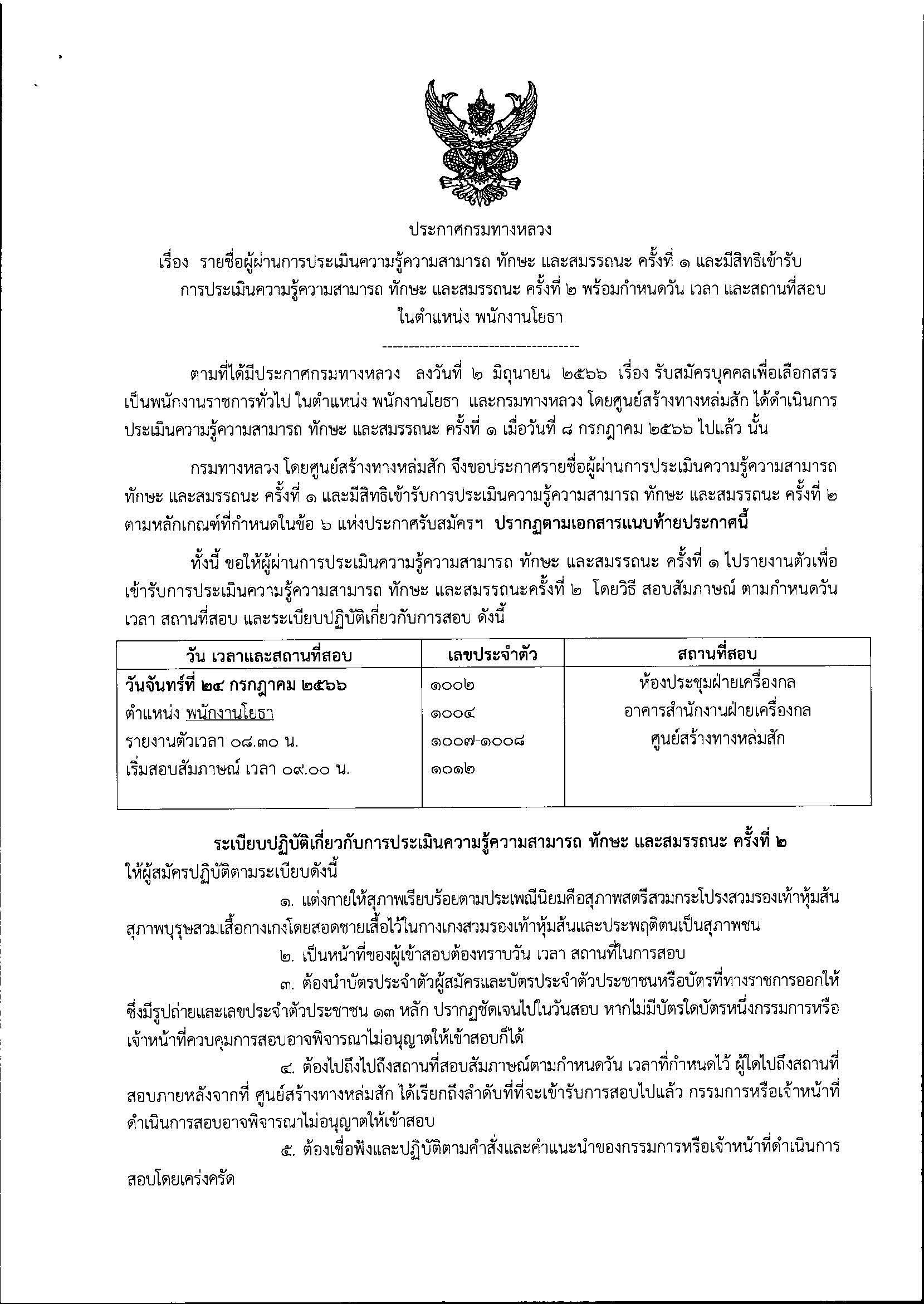 ประกาศรายชื่อผู้ผ่านการประเมินความรู้ความสามารถ ทักษะ และสมรรถนะ ครั้งที่ 1 และมีสิทธิเข้ารับการประเมินความรู้ความสามารถ ทักษะ และสมรรถนะ ครั้งที่ 2 พร้อมกำหนดวัน เวลา และสถานที่สอบ ในตำแหน่ง พนักงานโยธา