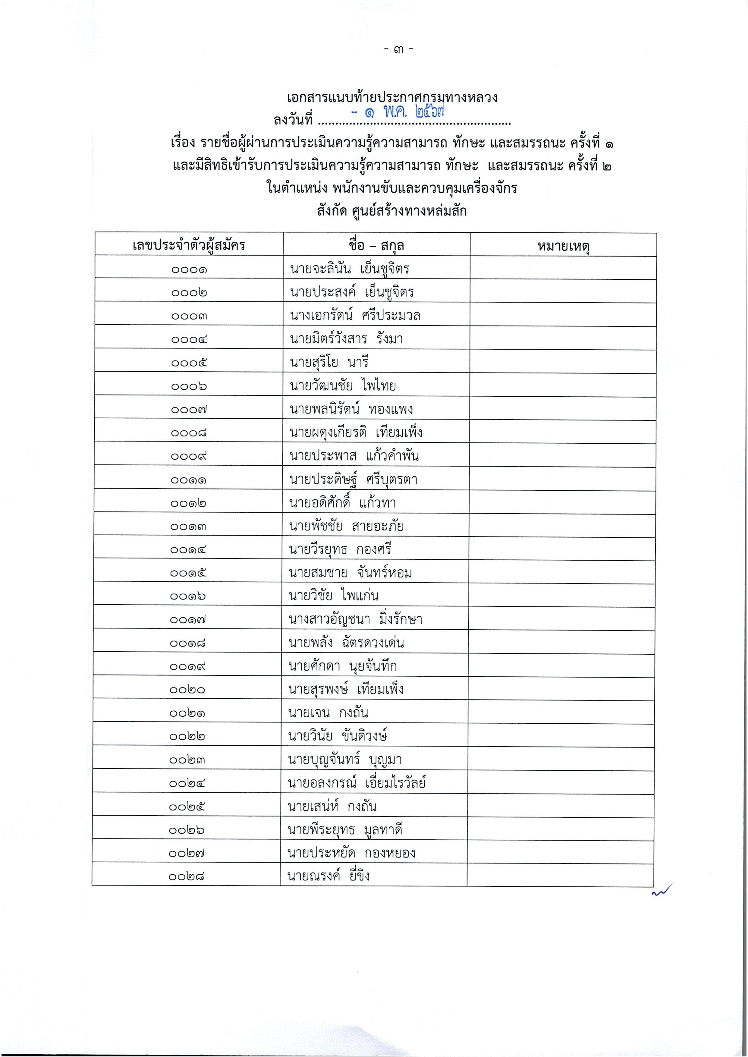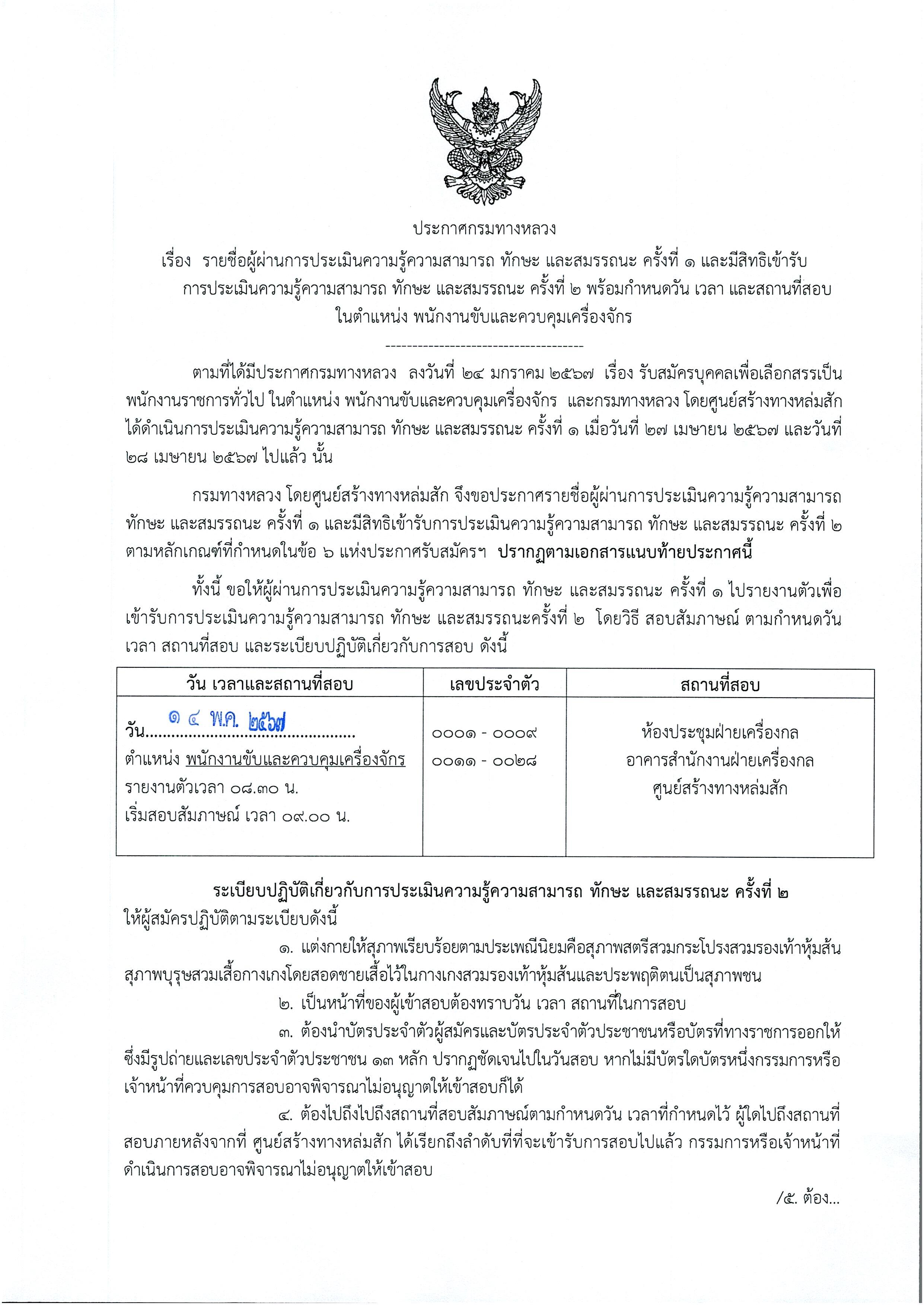 ประกาศรายชื่อผู้ผ่านการประเมินความรู้ความสามารถ ทักษะ และสมรรถนะ ครั้งที่ 1 และมีสิทธิเข้ารับการประเมินความรู้ความสามารถ ทักษะ และสมรรถนะ ครั้งที่ 2 พร้อมกำหนดวัน เวลา และสถานที่สอบ ในตำแหน่ง พนักงานขับและควบคุมเครื่องจักร