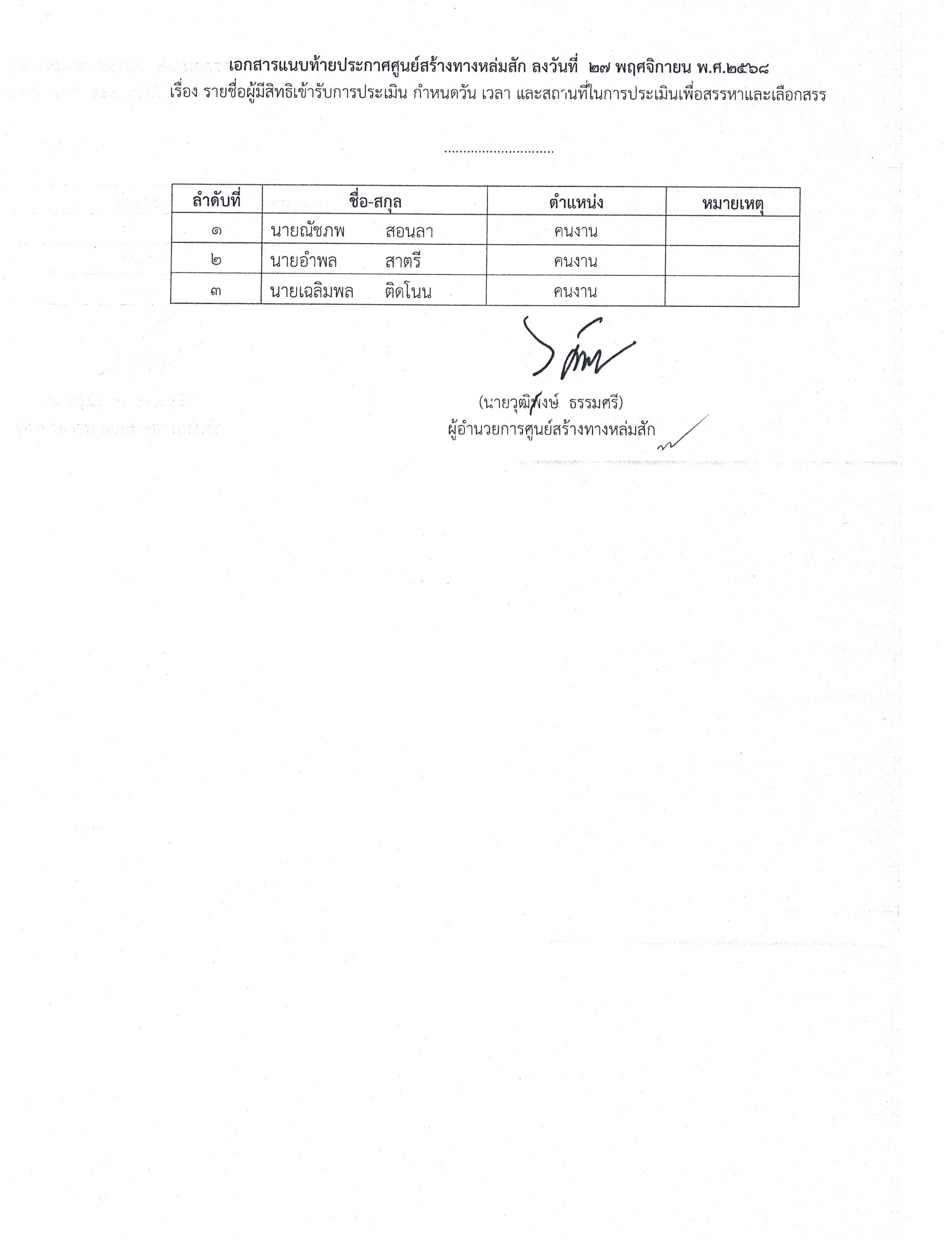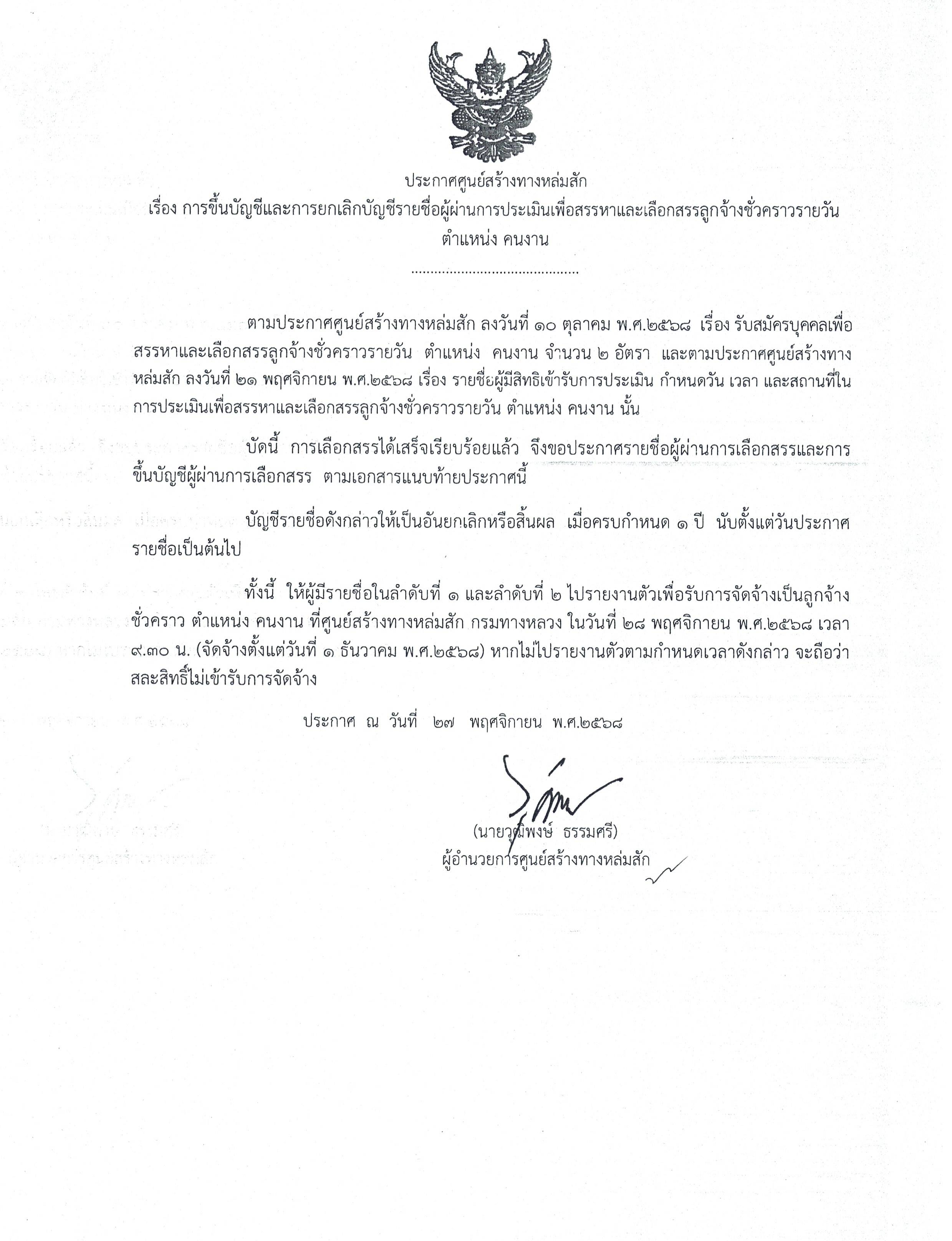 ศูนย์สร้างทางหล่มสัก ขอประชาสัมพันธ์ประกาศผลการประเมินเพื่อสรรหาและเลือกสรรลูกจ้างชั่วคราวรายวัน ตำแหน่งคนงาน พร้อมรายละเอียดการรายงานตัวตามประกาศ