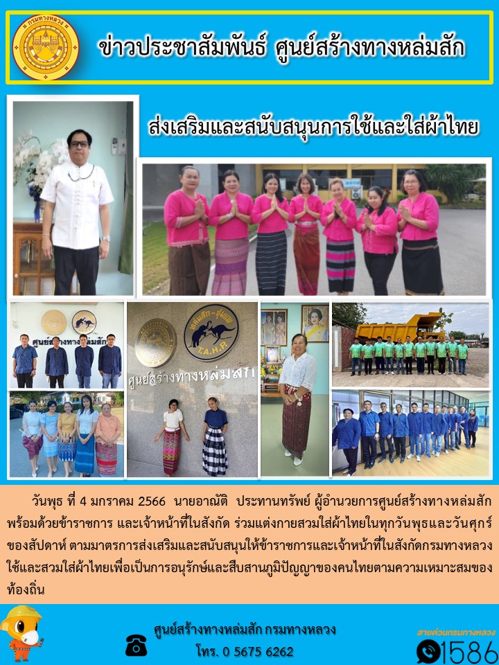 นายอาณัติ ประทานทรัพย์ ผู้อำนวยการศูนย์สร้างทางหล่มสัก พร้อมด้วยข้าราชการ และเจ้าหน้าที่ในสังกัด ร่วมแต่งกายสวมใส่ผ้าไทยในทุกวันพุธและวันศุกร์ของสัปดาห์ ตามมาตรการส่งเสริมและสนับสนุนให้ข้าราชการและเจ้าหน้าที่ในสังกัดกรมทางหลวงใช้และสวมใส่ผ้าไทยเพื่อเป็นการอนุรักษ์และสืบสานภูมิปัญญาของคนไทยตามความเหมาะสมของท้องถิ่น
