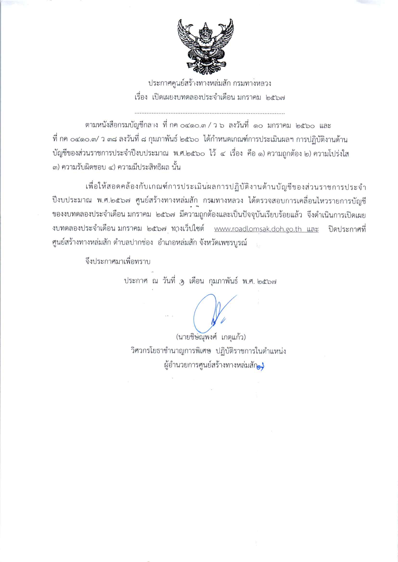 | ประกาศเปิดเผยงบทดลองประจำเดือน มกราคม 2567 ปีงบประมาณ 2567 ตามหนังสือกรมบัญชีกลาง ที่ กค 0410.3/ว 6 ลงวันที่ 10 มกราคม 2560 และ ที่ กค 0410.3/ ว 38 ลงวันที่ 8 กุมภาพันธ์ 2560 ได้กำหนดเกณฑ์การประเมินผลฯ การปฏิบัติงานด้านบัญชีของส่วนราชการประจำปีงบประมาณ พ.ศ.2560 ไว 4 เรื่อง 1.ความถูกต้อง 2.ความโปร่งใส 3.ความรับผิดชอบ 4.ความมีประสิทธิผล | 0 | ดาวน์โหลด |
