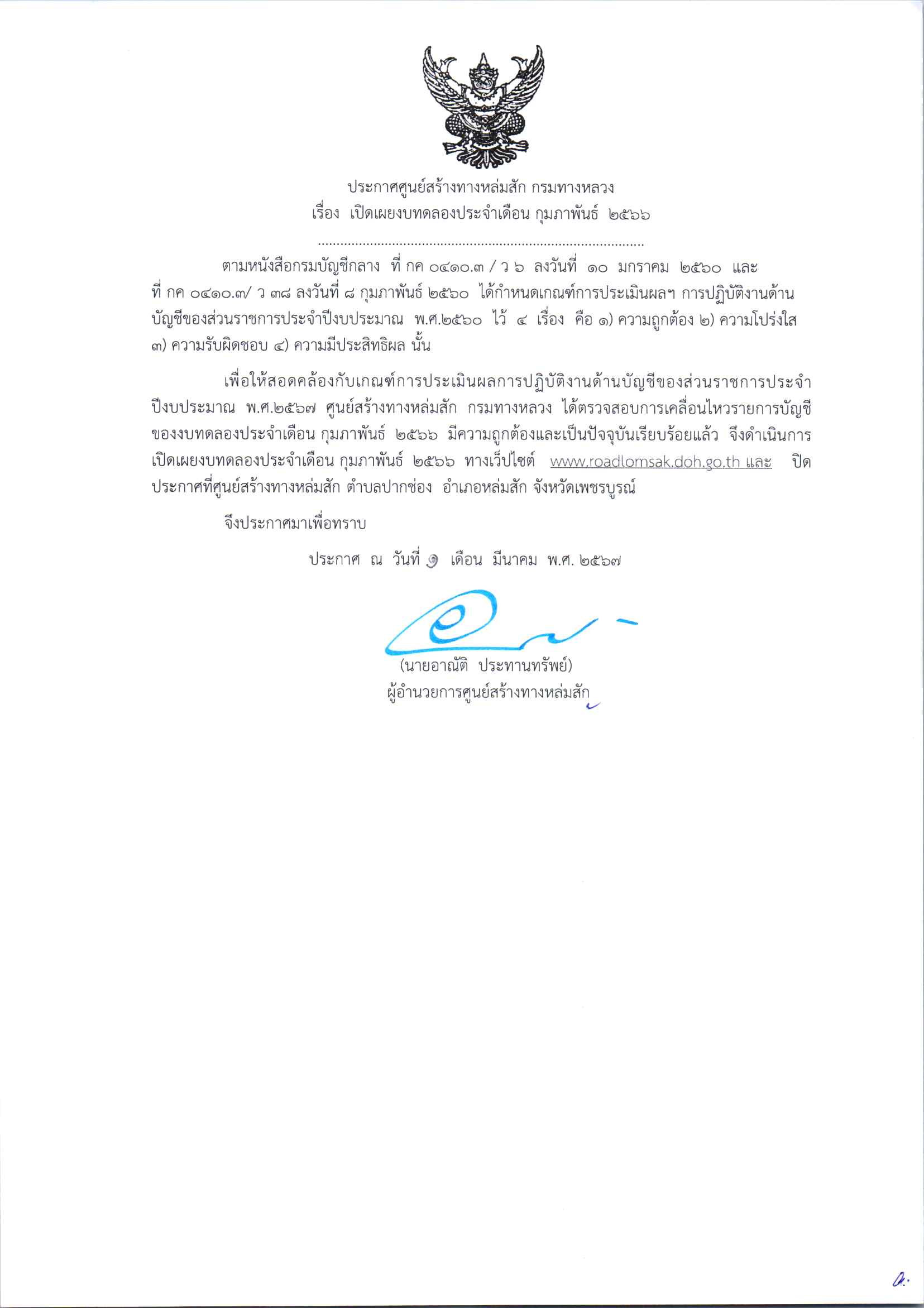 | ประกาศเปิดเผยงบทดลองประจำเดือน กุมภาพันธ์ 2567 ปีงบประมาณ 2567 ตามหนังสือกรมบัญชีกลาง ที่ กค 0410.3/ว 6 ลงวันที่ 10 มกราคม 2560 และ ที่ กค 0410.3/ ว 38 ลงวันที่ 8 กุมภาพันธ์ 2560 ได้กำหนดเกณฑ์การประเมินผลฯ การปฏิบัติงานด้านบัญชีของส่วนราชการประจำปีงบประมาณ พ.ศ.2560 ไว 4 เรื่อง 1.ความถูกต้อง 2.ความโปร่งใส 3.ความรับผิดชอบ 4.ความมีประสิทธิผล | 0 | ดาวน์โหลด |