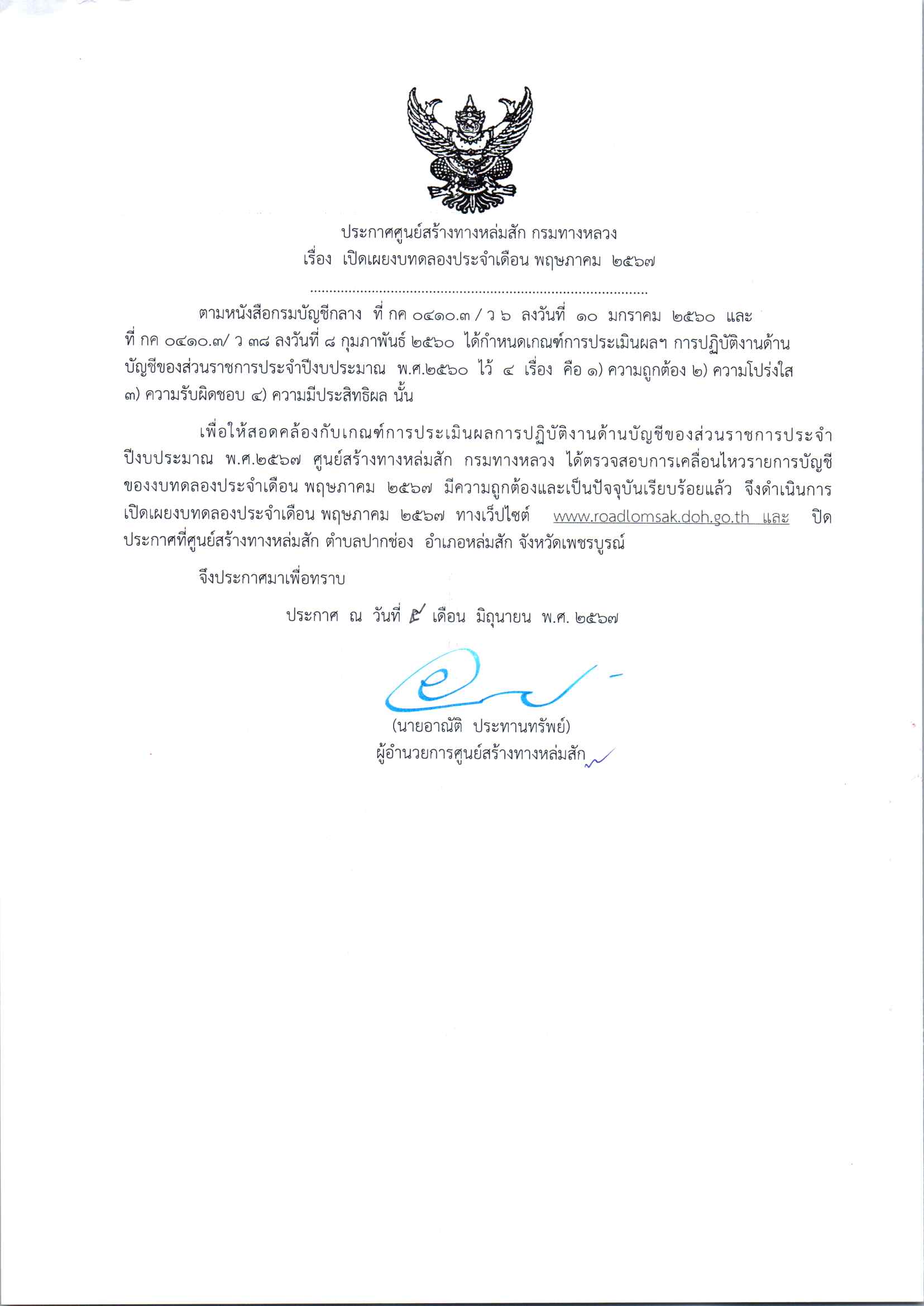 | ประกาศเปิดเผยงบทดลองประจำเดือน พฤษภาคม 2567 ปีงบประมาณ 2567 ตามหนังสือกรมบัญชีกลาง ที่ กค 0410.3/ว 6 ลงวันที่ 10 มกราคม 2560 และ ที่ กค 0410.3/ ว 38 ลงวันที่ 8 กุมภาพันธ์ 2560 ได้กำหนดเกณฑ์การประเมินผลฯ การปฏิบัติงานด้านบัญชีของส่วนราชการประจำปีงบประมาณ พ.ศ.2560 ไว 4 เรื่อง 1.ความถูกต้อง 2.ความโปร่งใส 3.ความรับผิดชอบ 4.ความมีประสิทธิผล | 0 | ดาวน์โหลด |