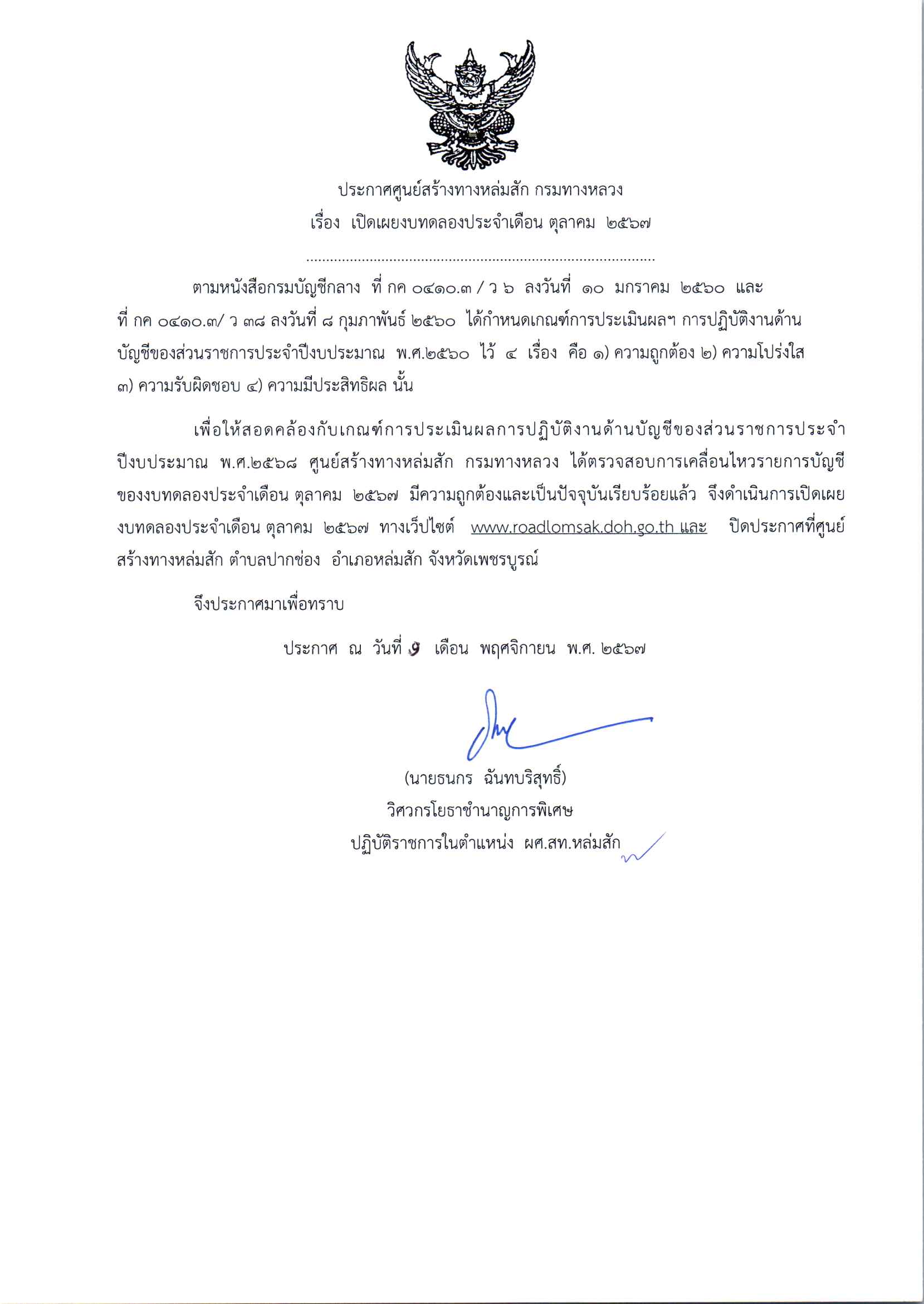 | ประกาศเปิดเผยงบทดลองประจำเดือน ตุลาคม 2567 ปีงบประมาณ 2568 ตามหนังสือกรมบัญชีกลาง ที่ กค 0410.3/ว 6 ลงวันที่ 10 มกราคม 2560 และ ที่ กค 0410.3/ ว 38 ลงวันที่ 8 กุมภาพันธ์ 2560 ได้กำหนดเกณฑ์การประเมินผลฯ การปฏิบัติงานด้านบัญชีของส่วนราชการประจำปีงบประมาณ พ.ศ.2560 ไว 4 เรื่อง 1.ความถูกต้อง 2.ความโปร่งใส 3.ความรับผิดชอบ 4.ความมีประสิทธิผล | 0 | ดาวน์โหลด |
