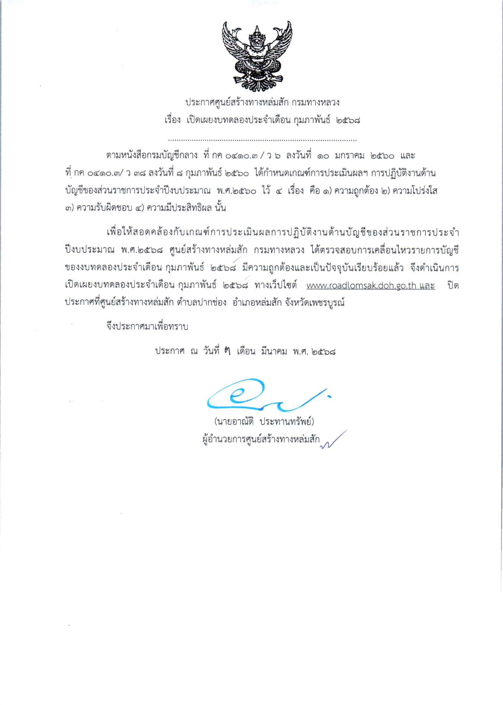 ประกาศเปิดเผยงบทดลองประจำเดือน กุมภาพันธ์ 2568 ปีงบประมาณ 2568 ตามหนังสือกรมบัญชีกลาง ที่ กค 0410.3/ว 2 ลงวันที่ 10 กรกฎาคม 2560 และ ที่ กค 0410.3/ ว 38 ลงวันที่ 8 กุมภาพันธ์ 2560 ได้กำหนดเกณฑ์การประเมินผลฯ การปฏิบัติงานด้านบัญชีของส่วนราชการประจำปีงบประมาณ พ.ศ.2560 ไว 4 เรื่อง 1.ความถูกต้อง 2.ความโปร่งใส 3.ความรับผิดชอบ 4.ความมีประสิทธิผล