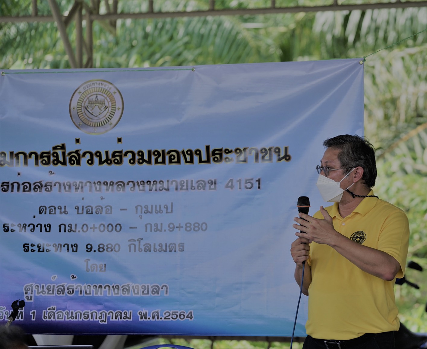 การประชุมการมีส่วนร่วมของประชาชน ด้วยศูนย์สร้างทางสงขลา ได้รับมอบหมายภารกิจให้ดำเนินการ โครงการก่อสร้างทางหลวง กิจกรรมก่อสร้างทางหลวงแผ่นดิน (งานดำเนินการเอง) ในทางหลวงหมายเลข 4151 ตอน บ่อล้อ - กุมแป ระหว่างกม. 0+000 - กม.9+880 ระยะทาง 9.880 กิโลเมตร ในพื้นที่ตำบลแม่เจ้าอยู่หัว อำเภอเชียรใหญ่ และตำบลสวนหลวง อำเภอเฉลิมพระเกียรติ จังหวัดนครศรีธรรมราช งานกิจกรรมการมีส่วนร่วมของประชาชน เพื่อให้ประชาชน มีความรู้ ความเข้าใจ และแสดงความคิดเห็นที่มีประโยชน์สูงสุดต่อโครงการดังกล่าว